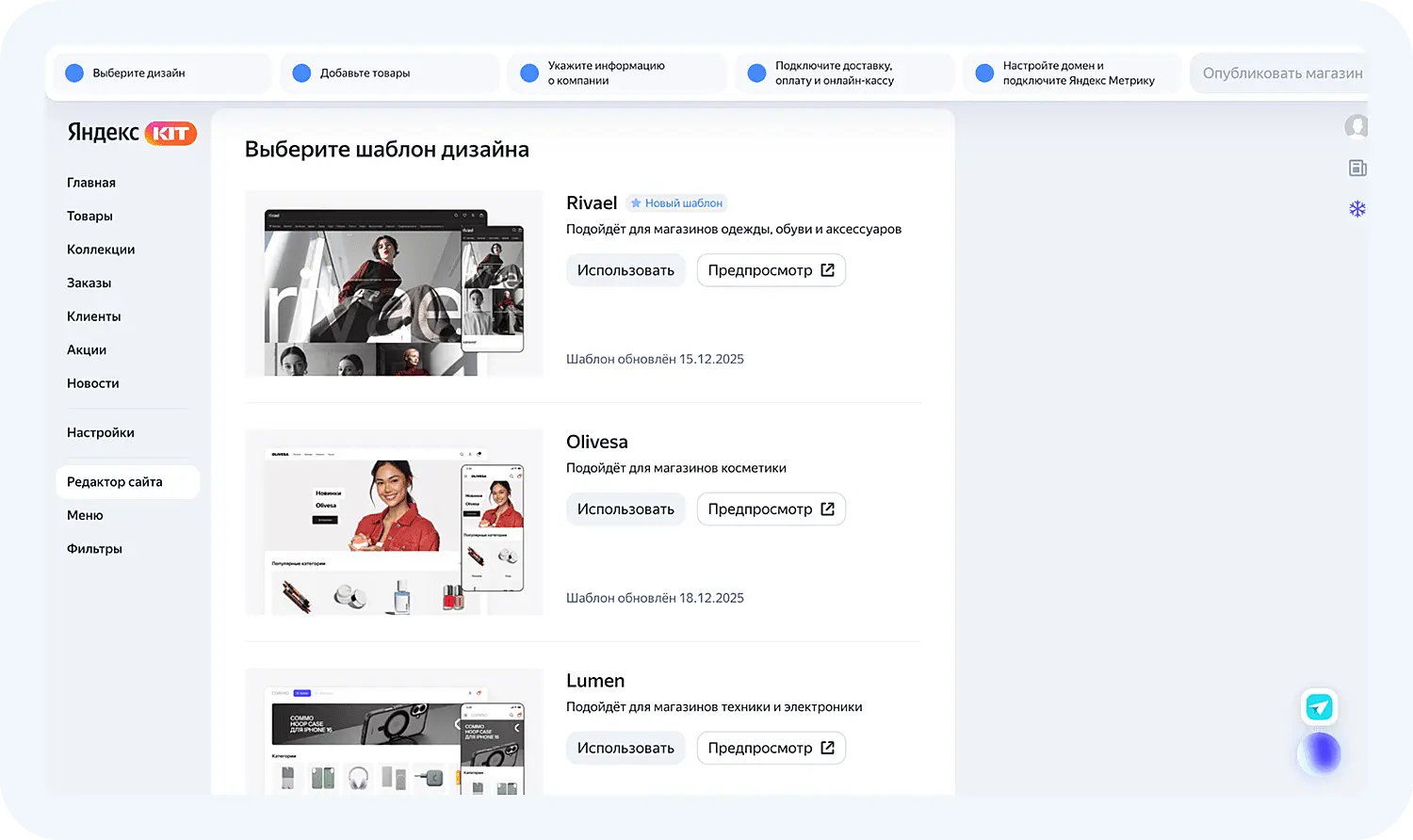 Яндекс KIT — это новая технологическая платформа от Яндекса, запущенная в 2025 году. На ней предприниматели могут быстро создавать полноценные интернет-магазины «под ключ». Если раньше для запуска независимого сайта требовался штат разработчиков и месяцы настроек, то теперь Яндекс предлагает готовое решение.