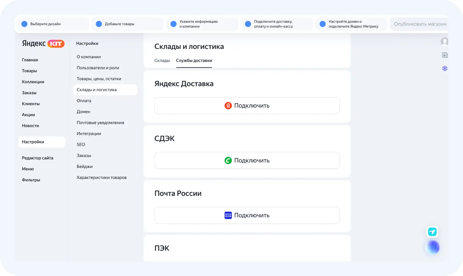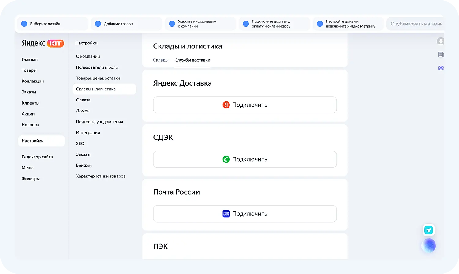 В раздел Склады и логистика вы можете внести информацию о существующих складах и подключить сервисы доставки напрямую к вашему магазину в Яндекс KIT:
