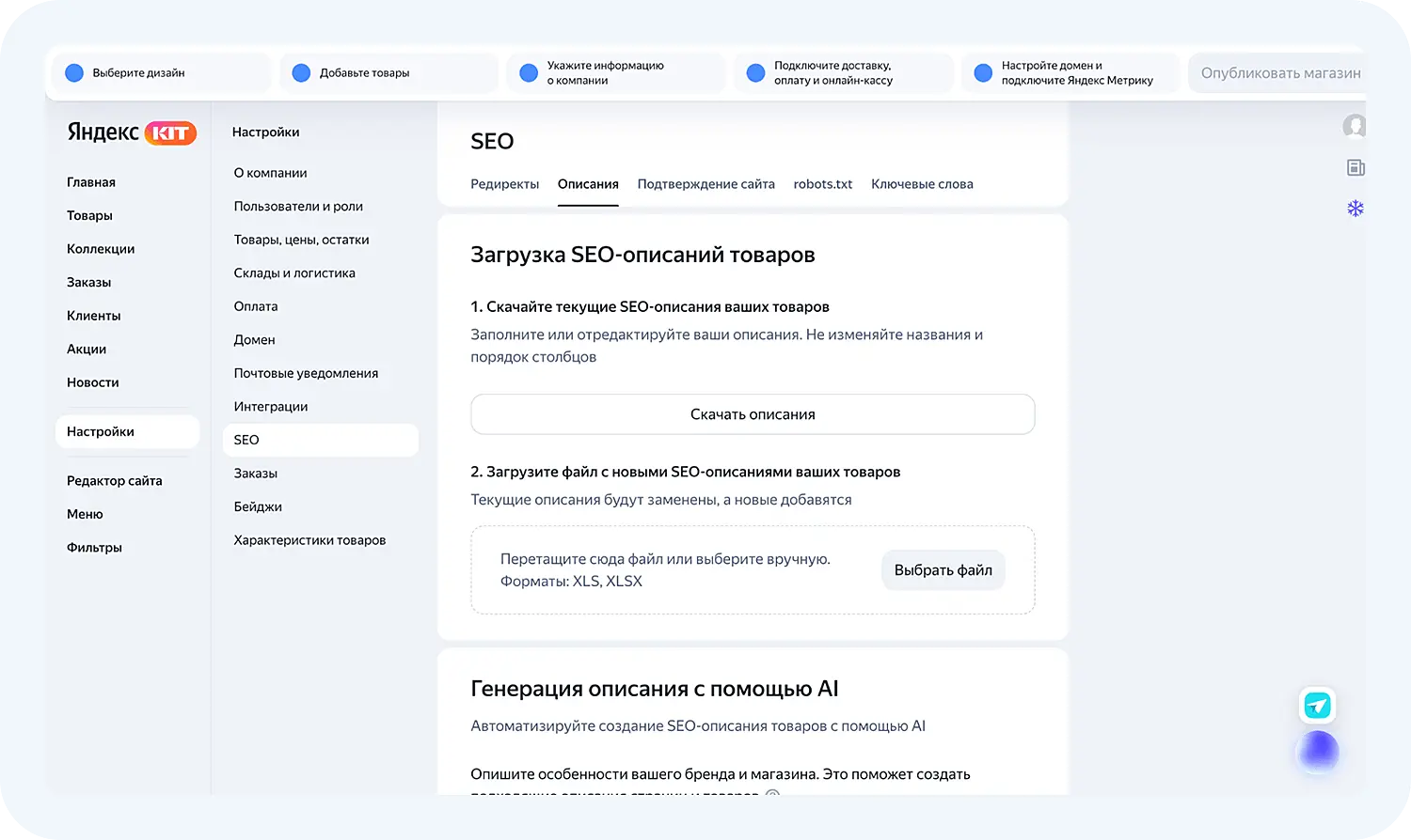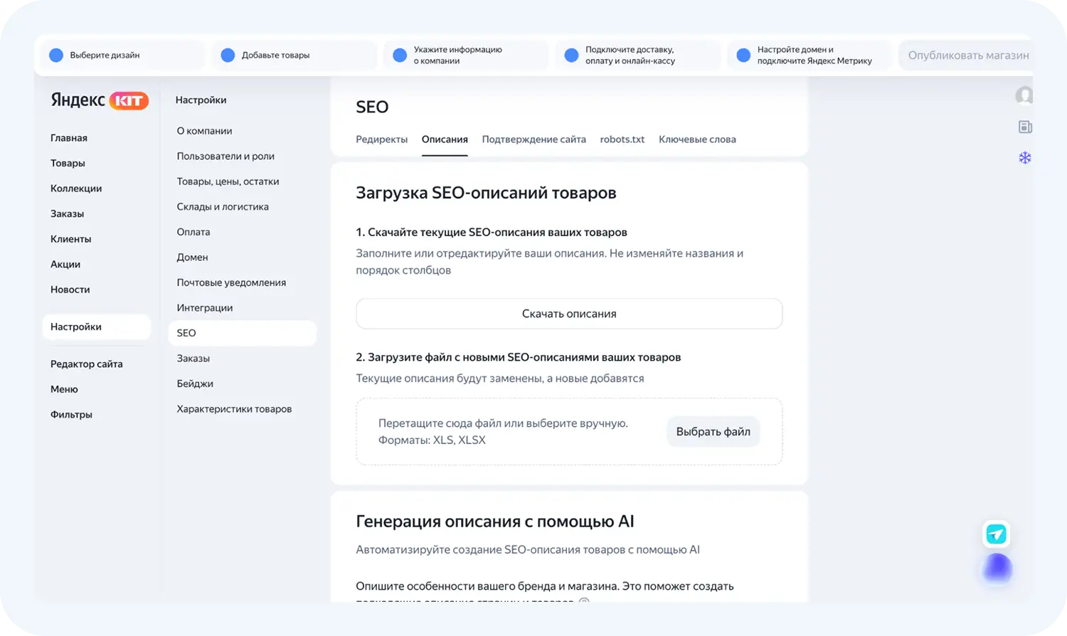 В разделе SEO вы можете подгрузить SEO-описания для товаров или сгенерировать их прямо в сервисе с помощью искусственного интеллекта: