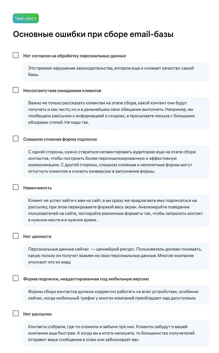 Чек-лист «Основные ошибки при сборе email-базы»