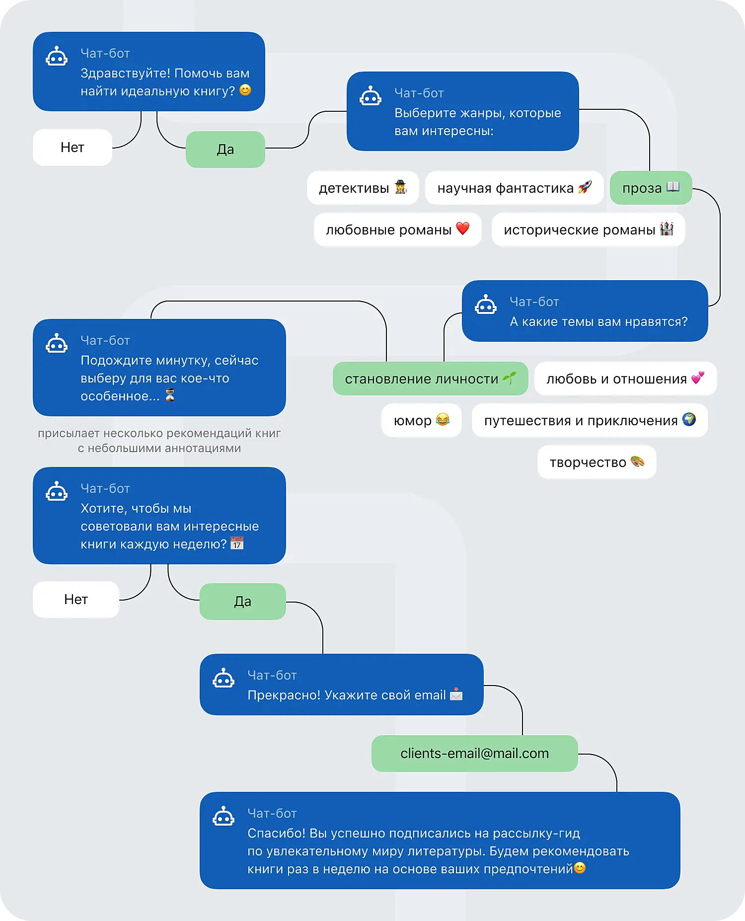 Представим книжный магазин. Клиент зашел на сайт и перешел в каталог книг с подключенным чат-ботом. Вот как может выглядеть сценарий их взаимодействия:
