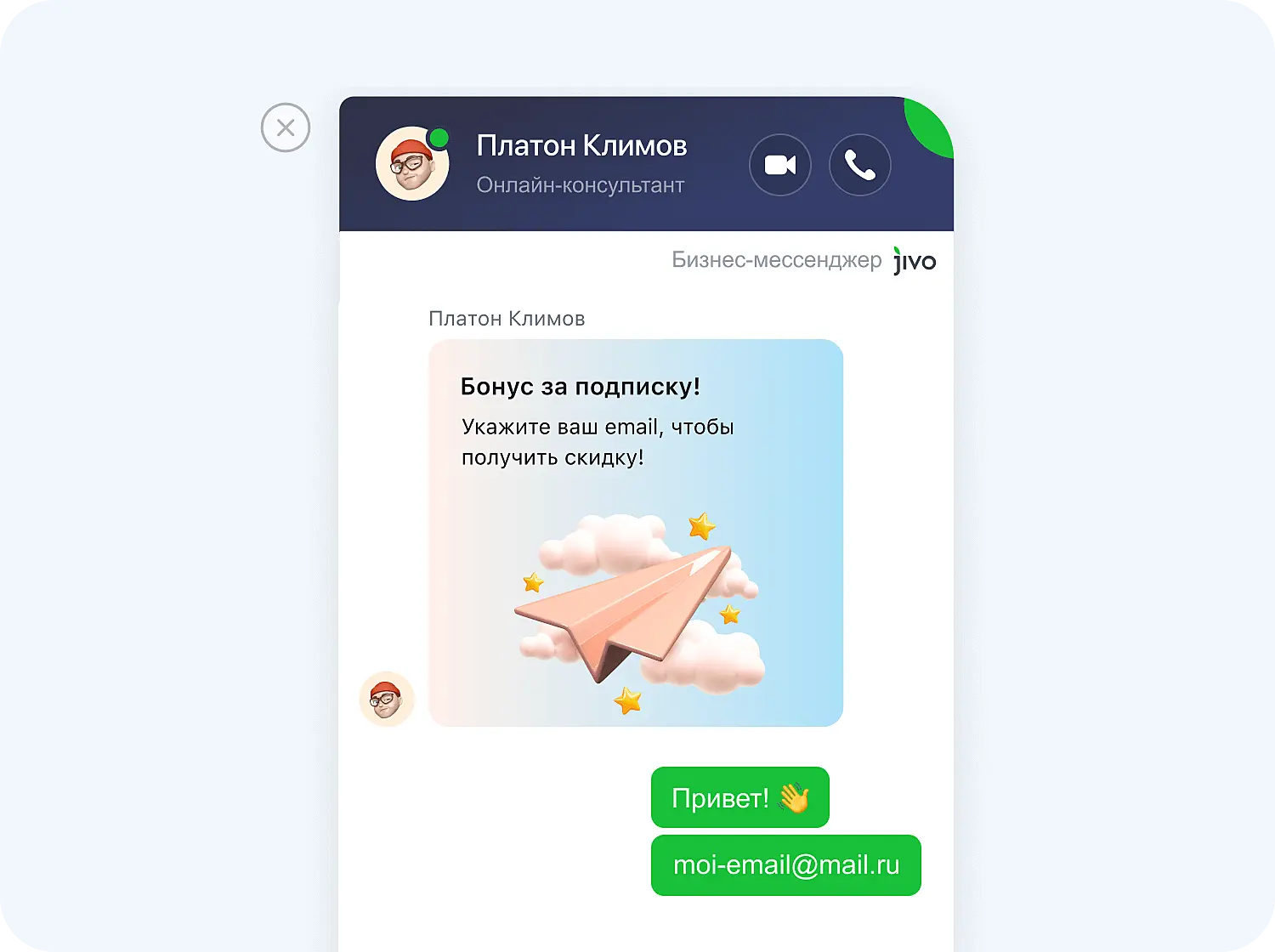 Клиент изучает ваш сайт — зацепите его внимание с помощью интерактивного сообщения в чате. Это еще один инструмент из блока Jivo Маркетинг. В отличие от стандартных приветствий в чате на сайте, интерактивное сообщение можно оформить ярче и интереснее. А наличие шаблонов облегчает процесс запуска до пары простых настроек. Добавьте кнопки с призывом вроде «Получить подарок», и новый email-адрес у вас в кармане!
