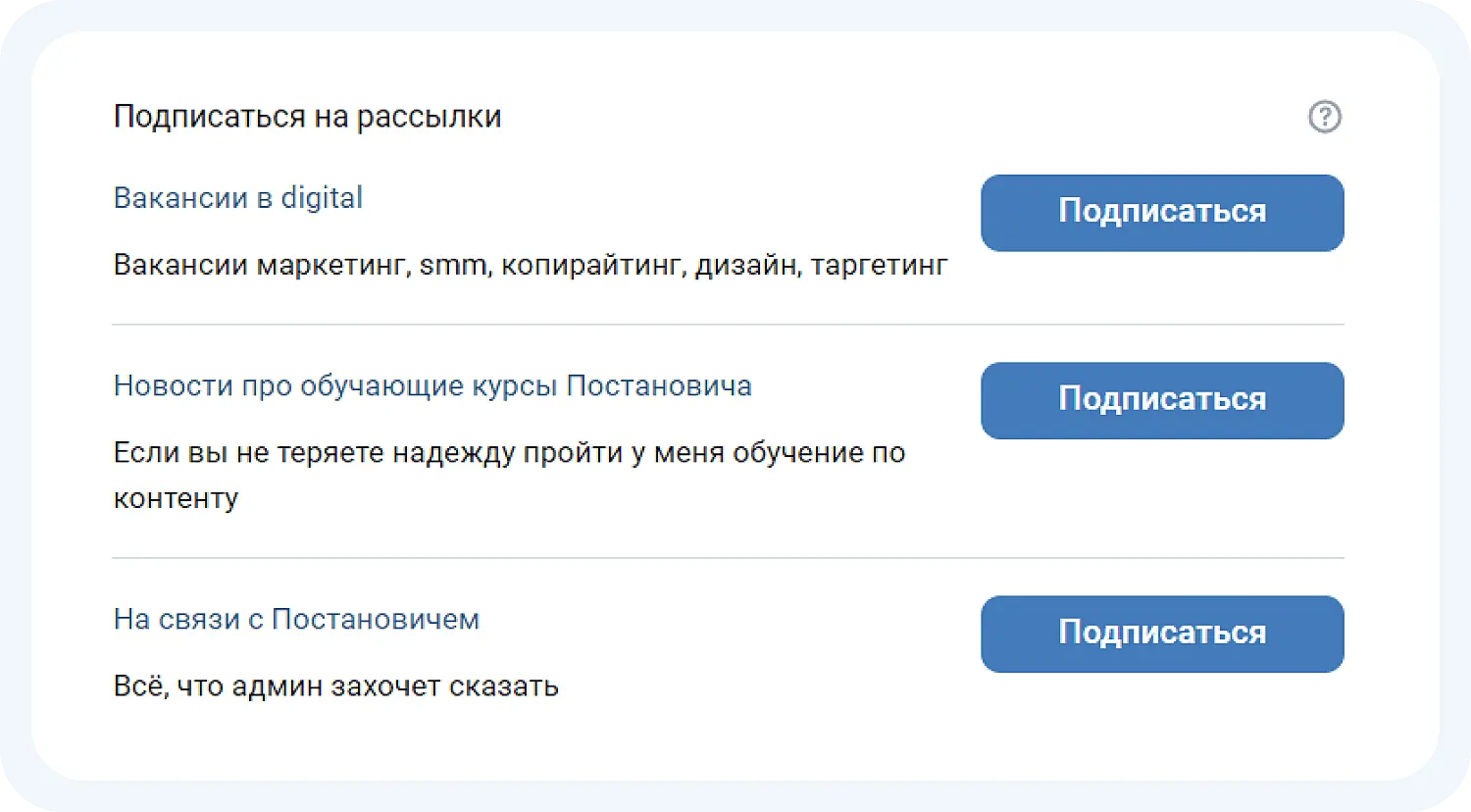 ВКонтакте и другие соцсети позволяют интегрировать формы подписки в сообщества с помощью встроенных приложений (например, miniApps, «Форма сбора заявок» в ВК) и сторонних сервисов (например, BotHelp, Senler).