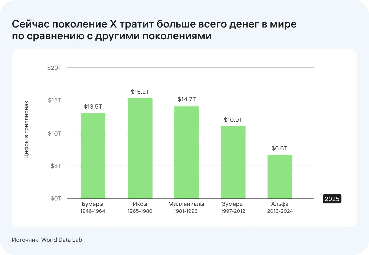 Сейчас они находятся на пике своего карьерного роста, а еще носят звание лидера по тратам во всем мире. По прогнозам World Data Lab, в 2025 году иксы во всем мире потратят 15.2 триллиона долларов.