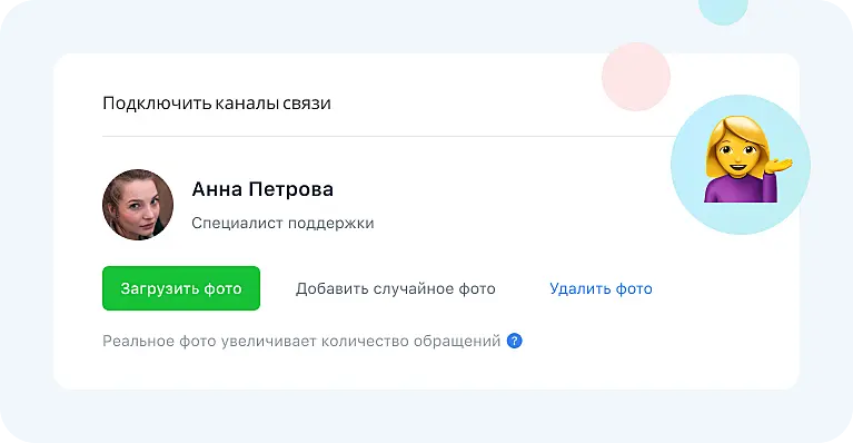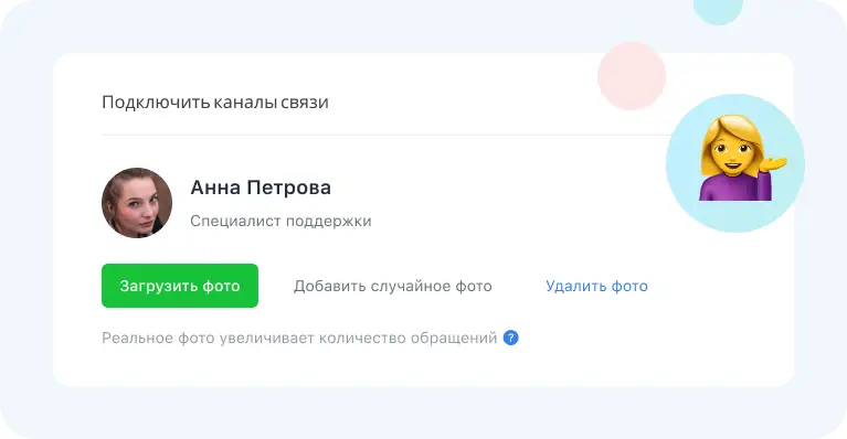 В Jivo можно выбрать рандомное фото из библиотеки изображений. Мы собрали реалистичные фотографии людей, которым без сомнения написали бы сами. И да, вы правильно поняли — если нет возможности установить свое, используйте изображение другого человека, внушающего доверие.
