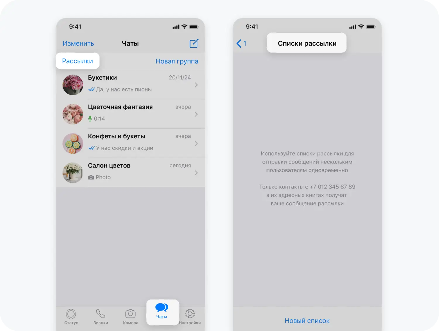 В версии для iOS на странице «Чаты» нажать на слово «Рассылки», а затем на «Новый список». Создать список получателей для рассылки сообщений.