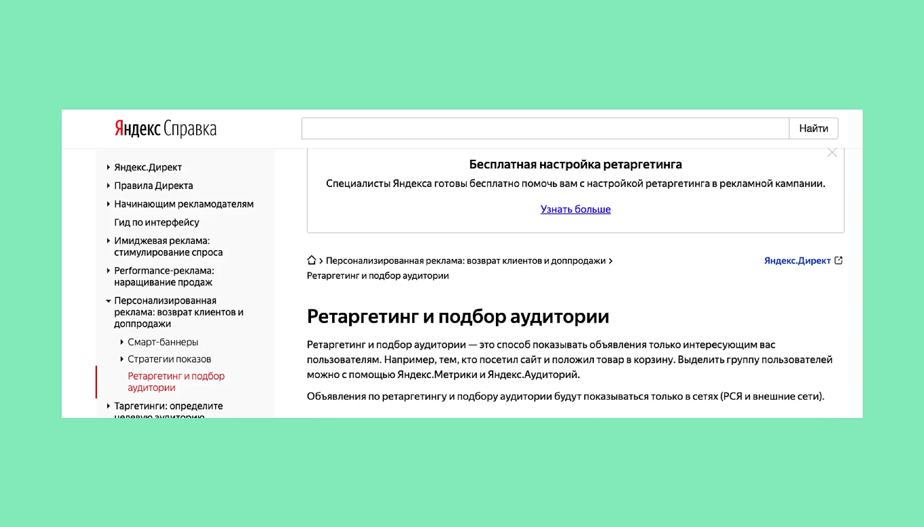 Ретаргетинг у Яндекса: «Ретаргетинг — это способ показывать объявления только интересующим вас пользователям. Например, тем, кто посетил сайт и положил товар в корзину».