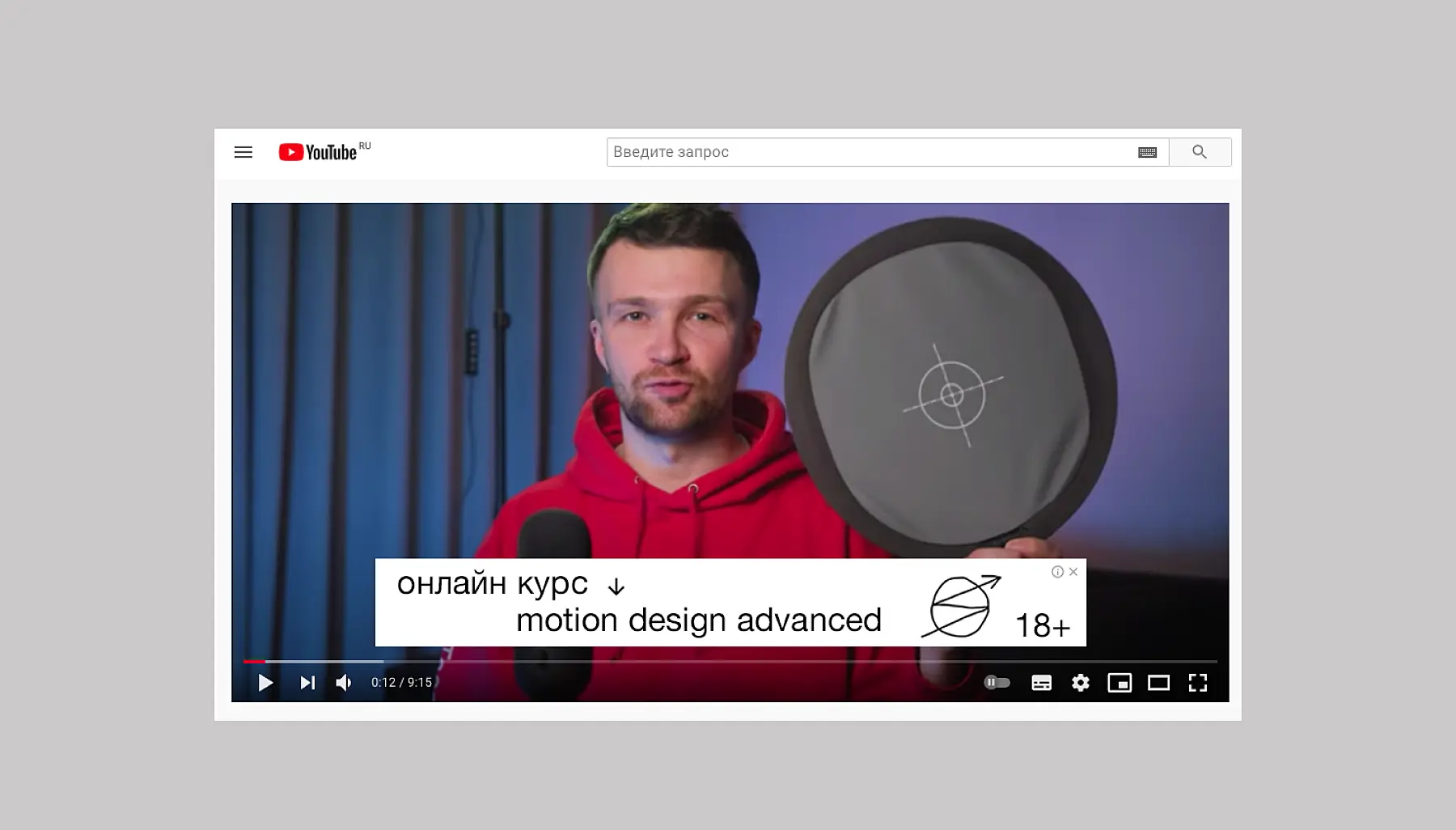 Ретаргетинг на Ютьюбе — рекламный баннер школы Сквот. Недавно я интересовался их курсом по моушен-дизайну.