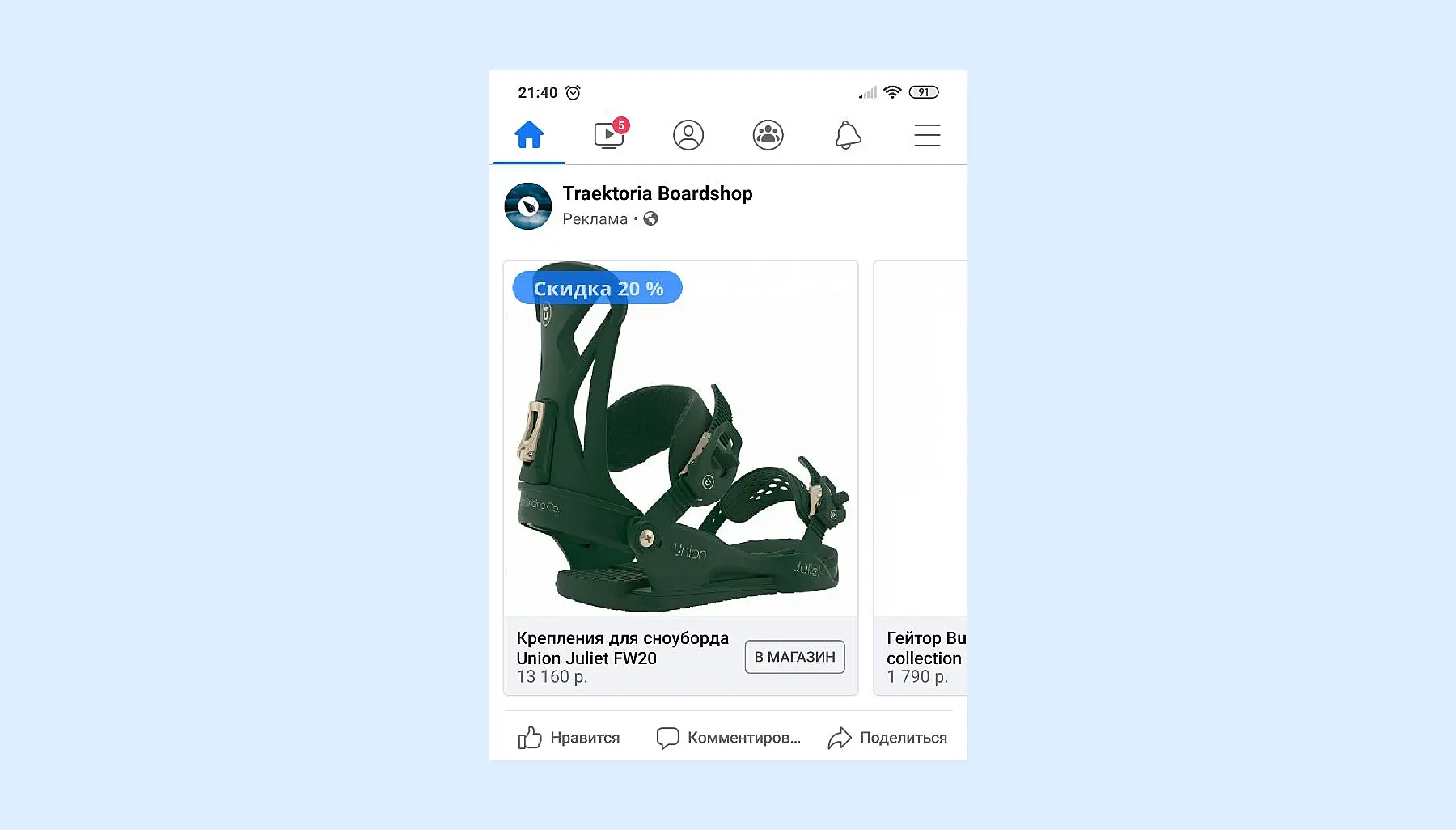 Пример ретаргетинга в ___ — недавно я выбирал крепления для сноуборда в магазине Траектория и теперь вижу их рекламу у себя в ленте.