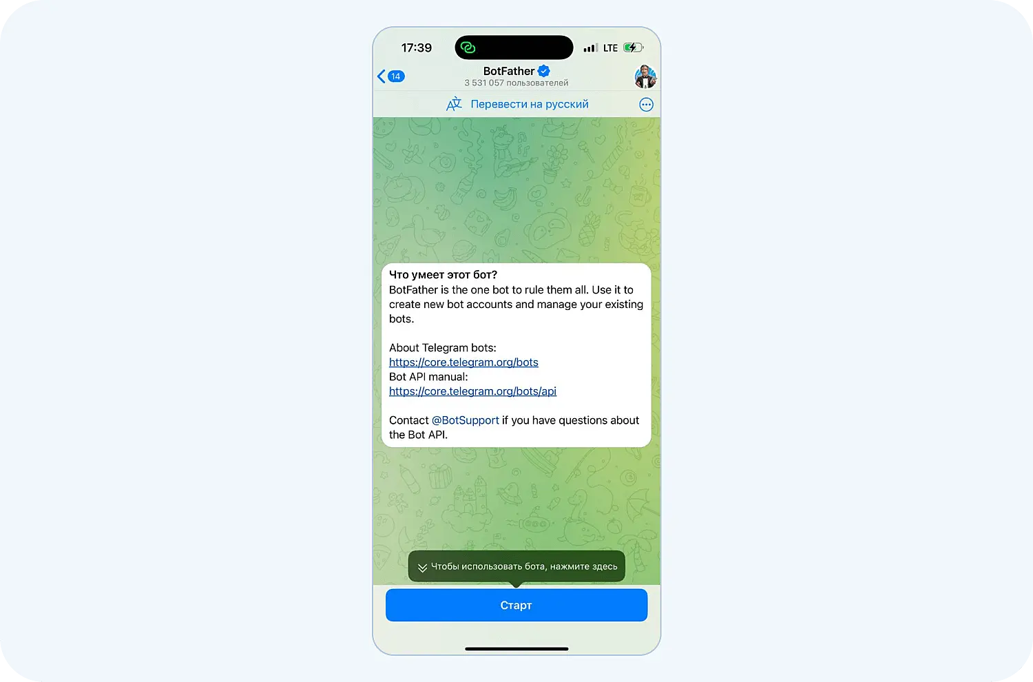 Перейдите в бот и нажмите кнопку Начать внизу экрана, чтобы запустить его: