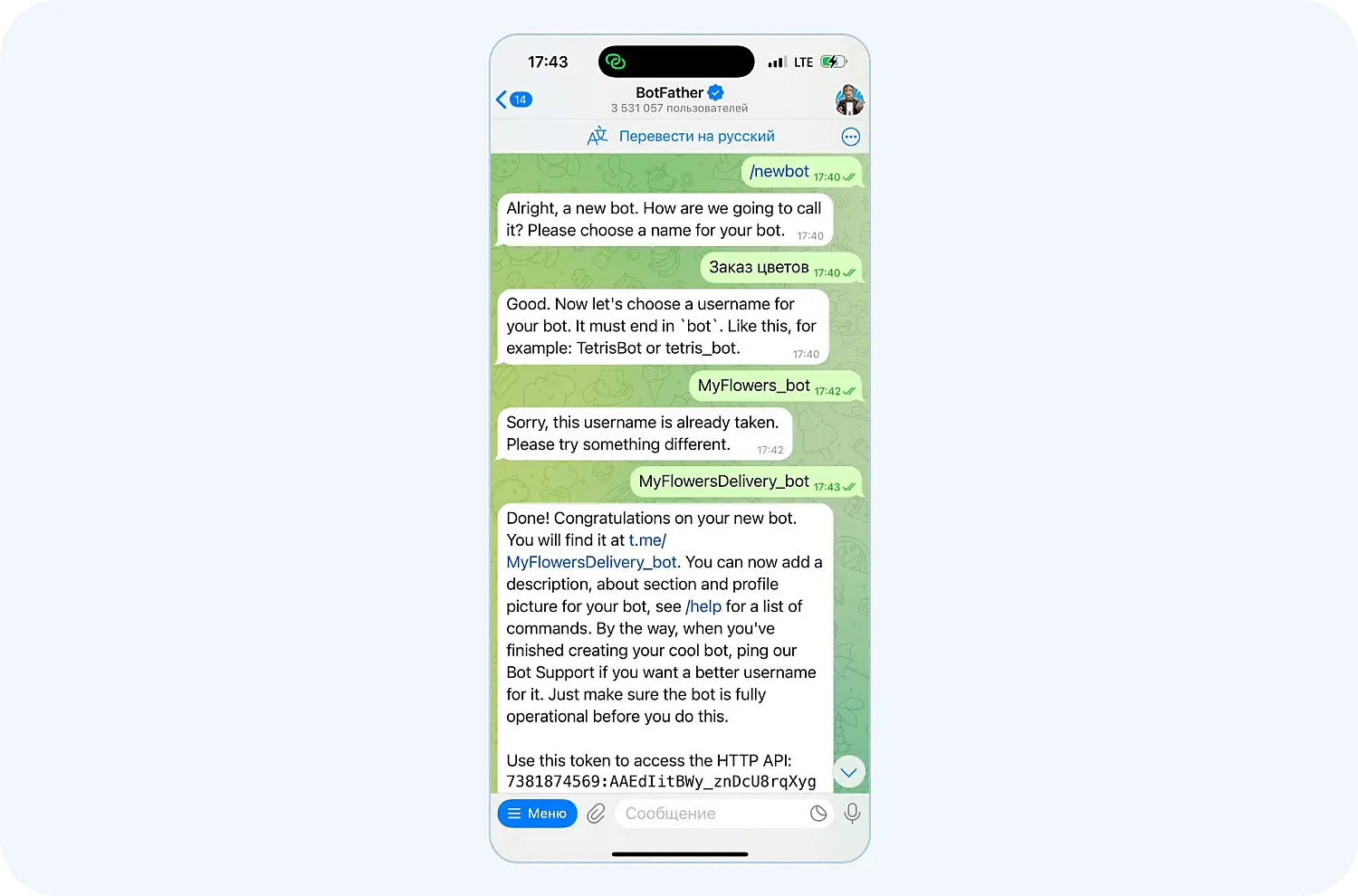 Ник должен быть уникальным и заканчиваться на слово bot. Вот как это может выглядеть на практике: