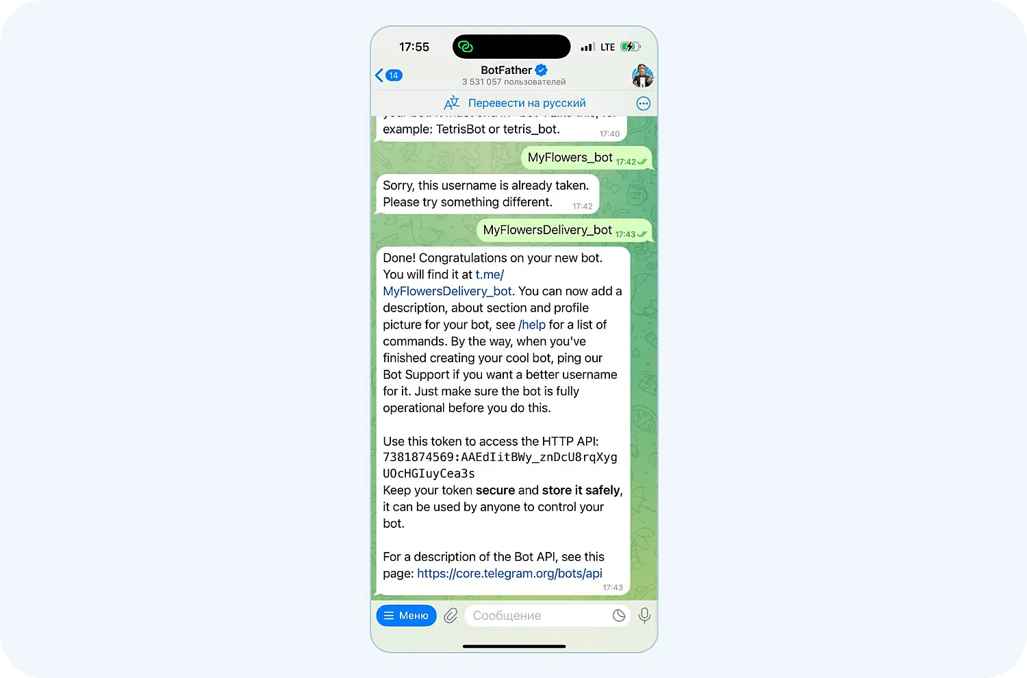 Токен нужно сохранить и никому не показывать — он важен так же, как и пароль от почты. Он понадобится для создания чат-бота для Телеграм через сторонние сервисы.