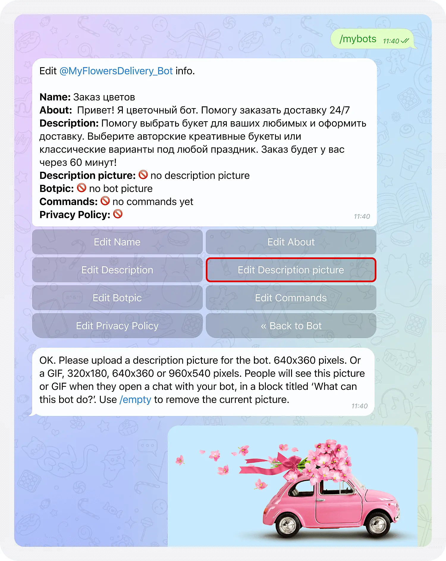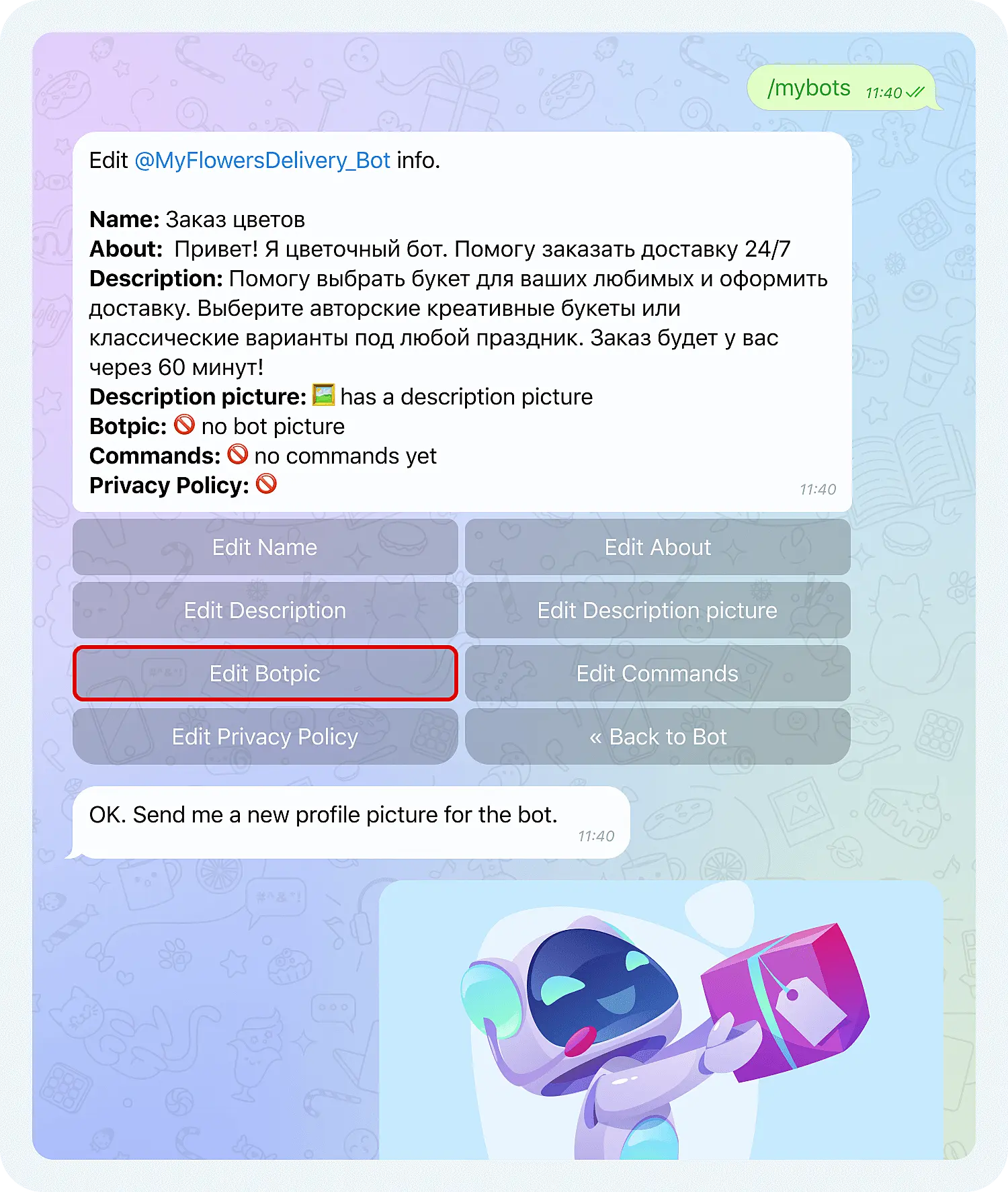 4. Edit Botpic. Команда позволяет загрузить аватарку для бота: