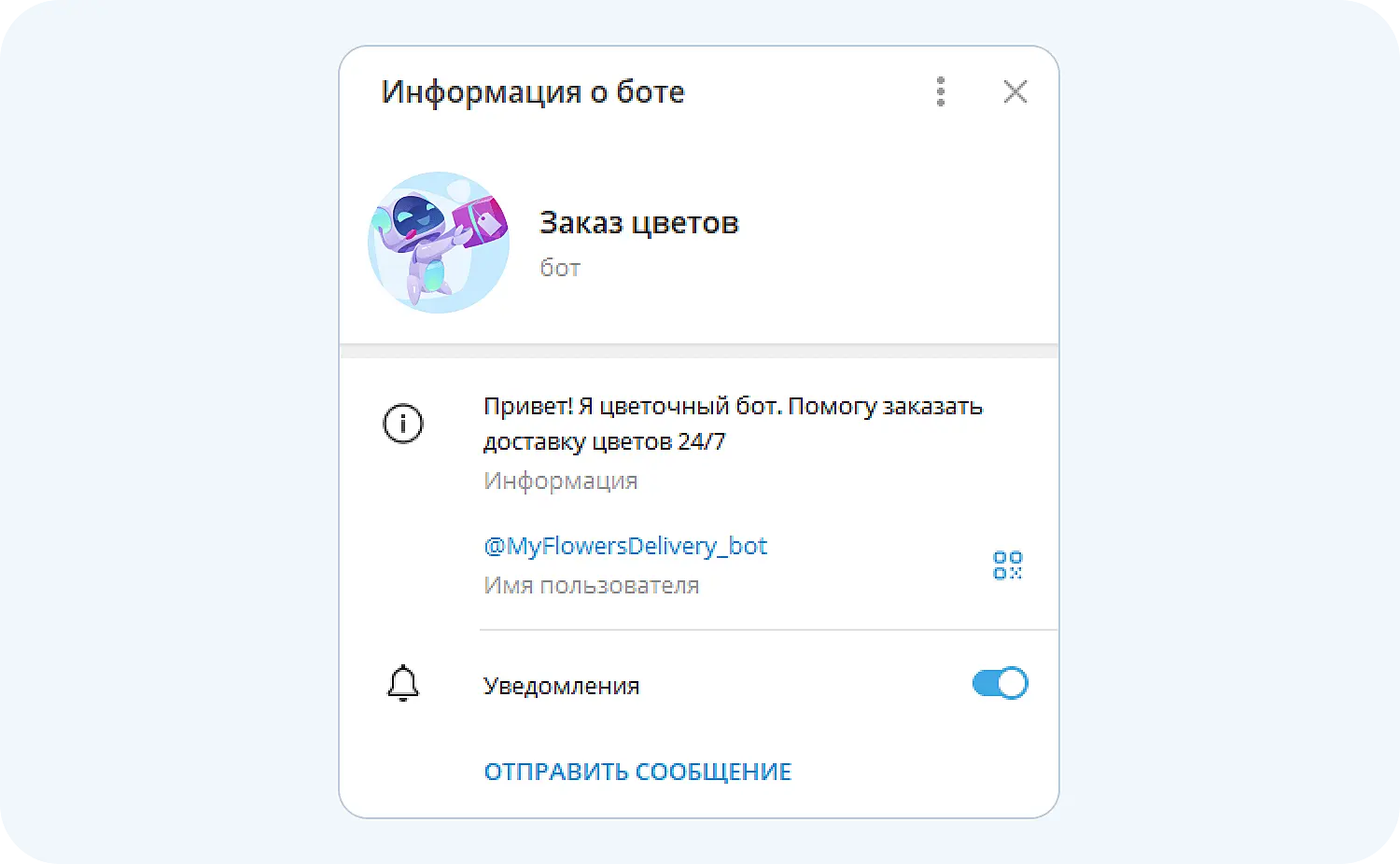 Теперь аватарка отобразится в профиле и при поиске бота в результатах выдачи: