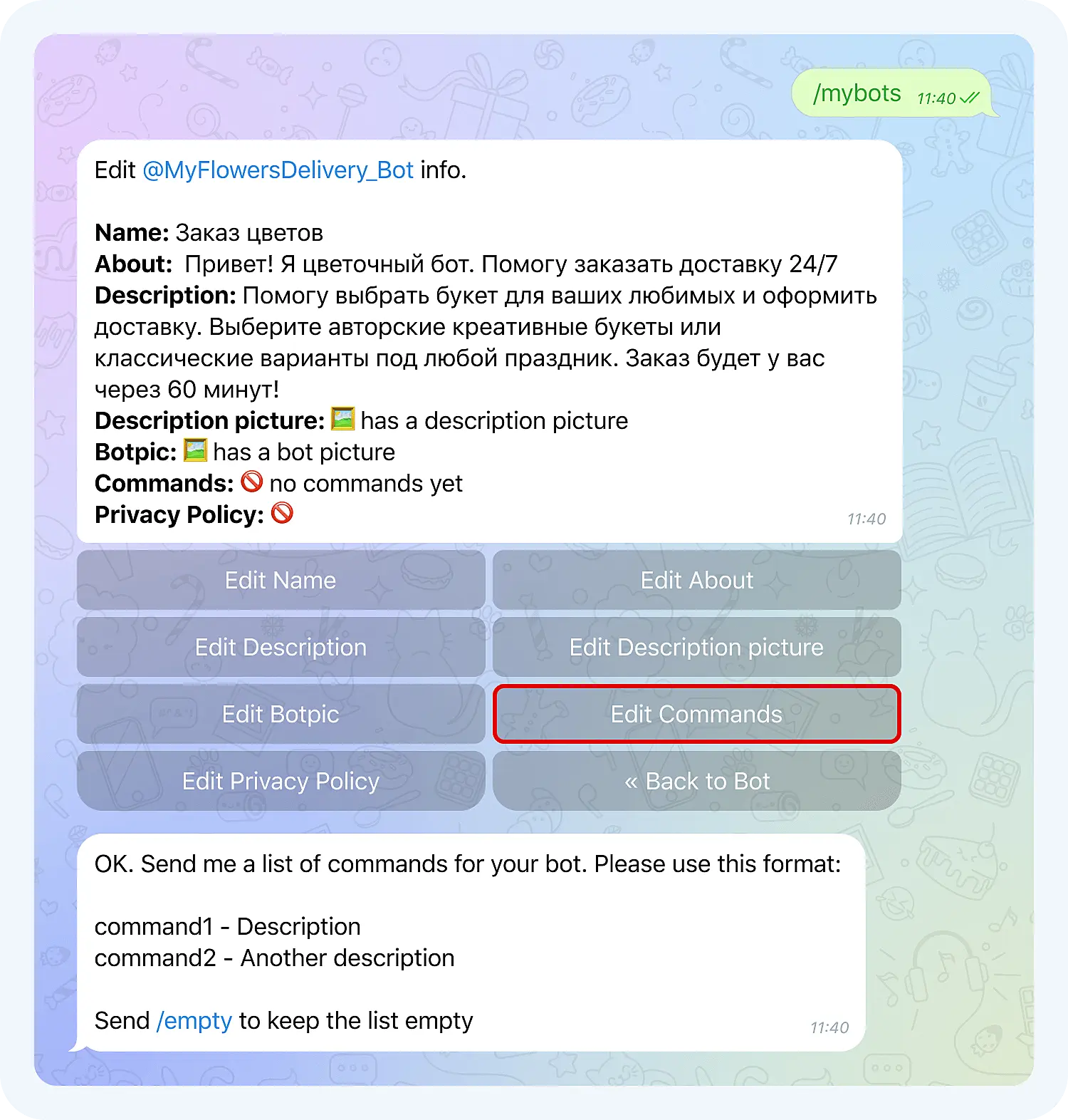 5. Edit Commands — настройка команд, которые задают действия чат-бота в Телеграм: