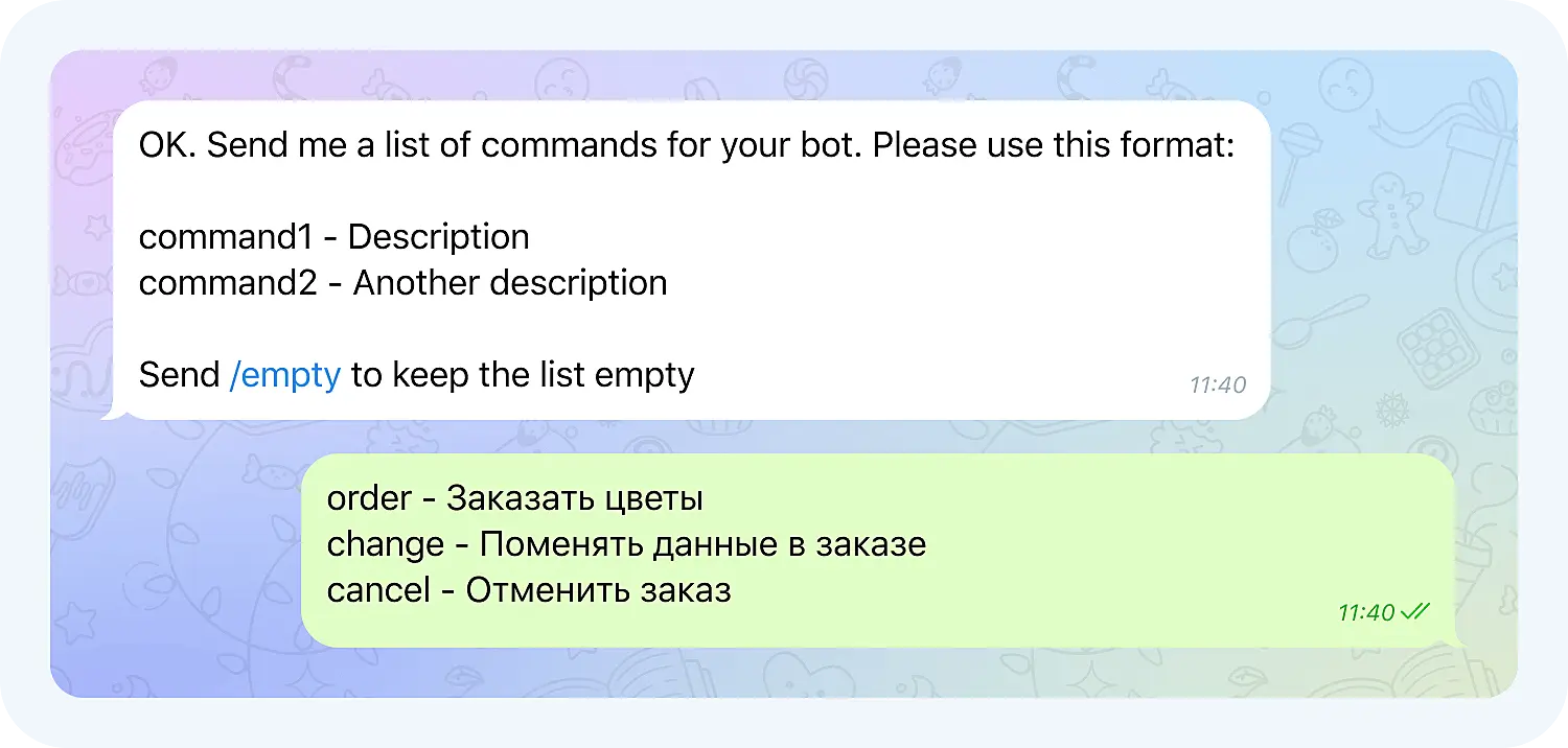 Теперь эти команды станут доступны пользователям бота: