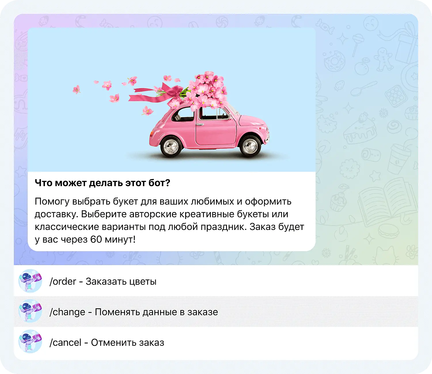 Например, можно добавить команды для заказа цветов, изменения данных и отмены заказа:
