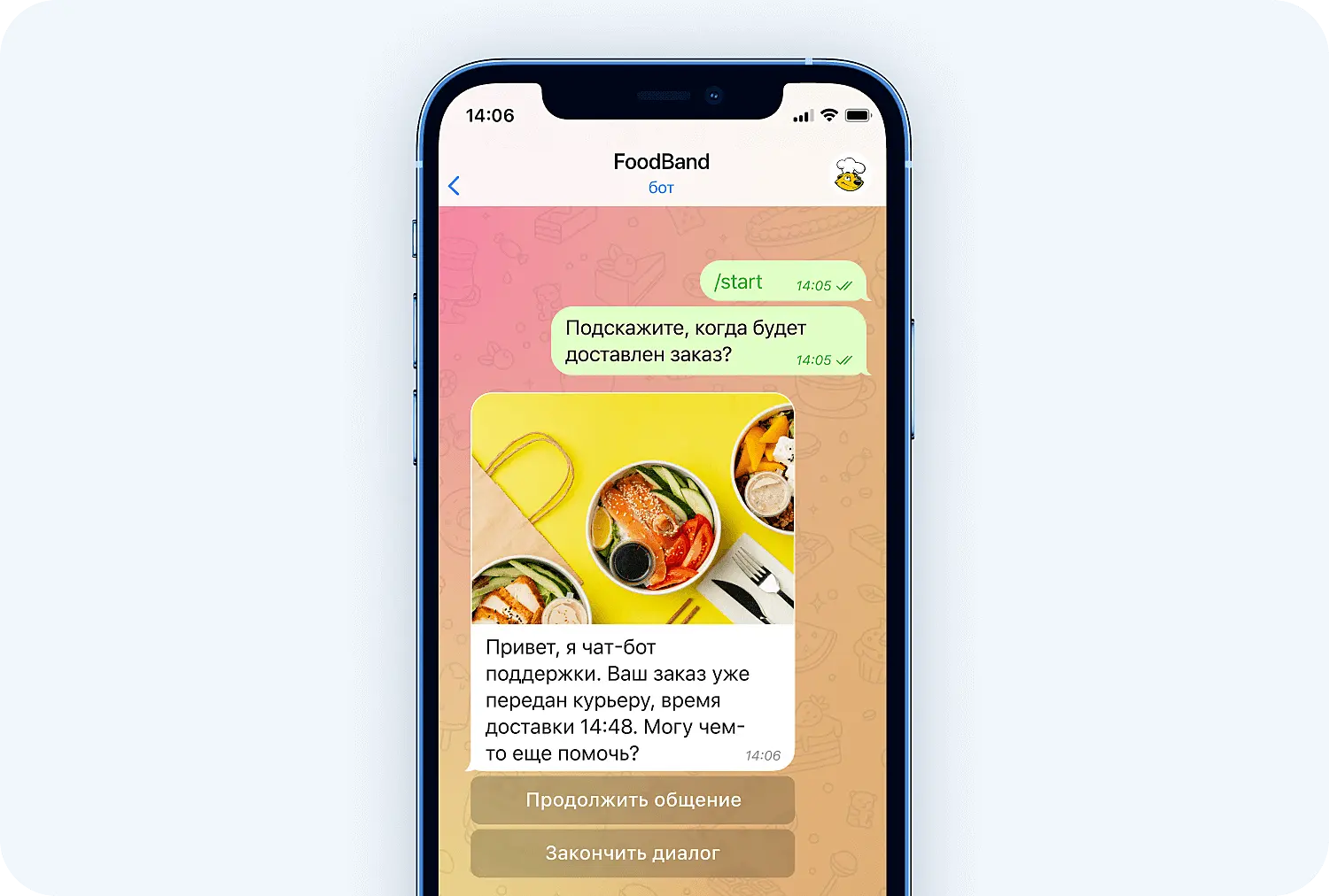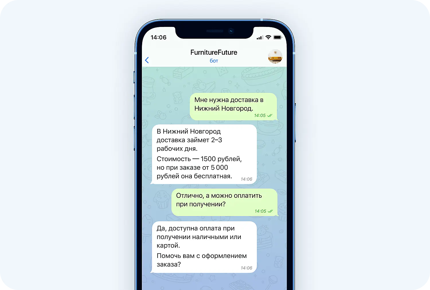 3. Обработка заказов. Бот помогает оформить заказ и получить уведомление о статусе доставки: