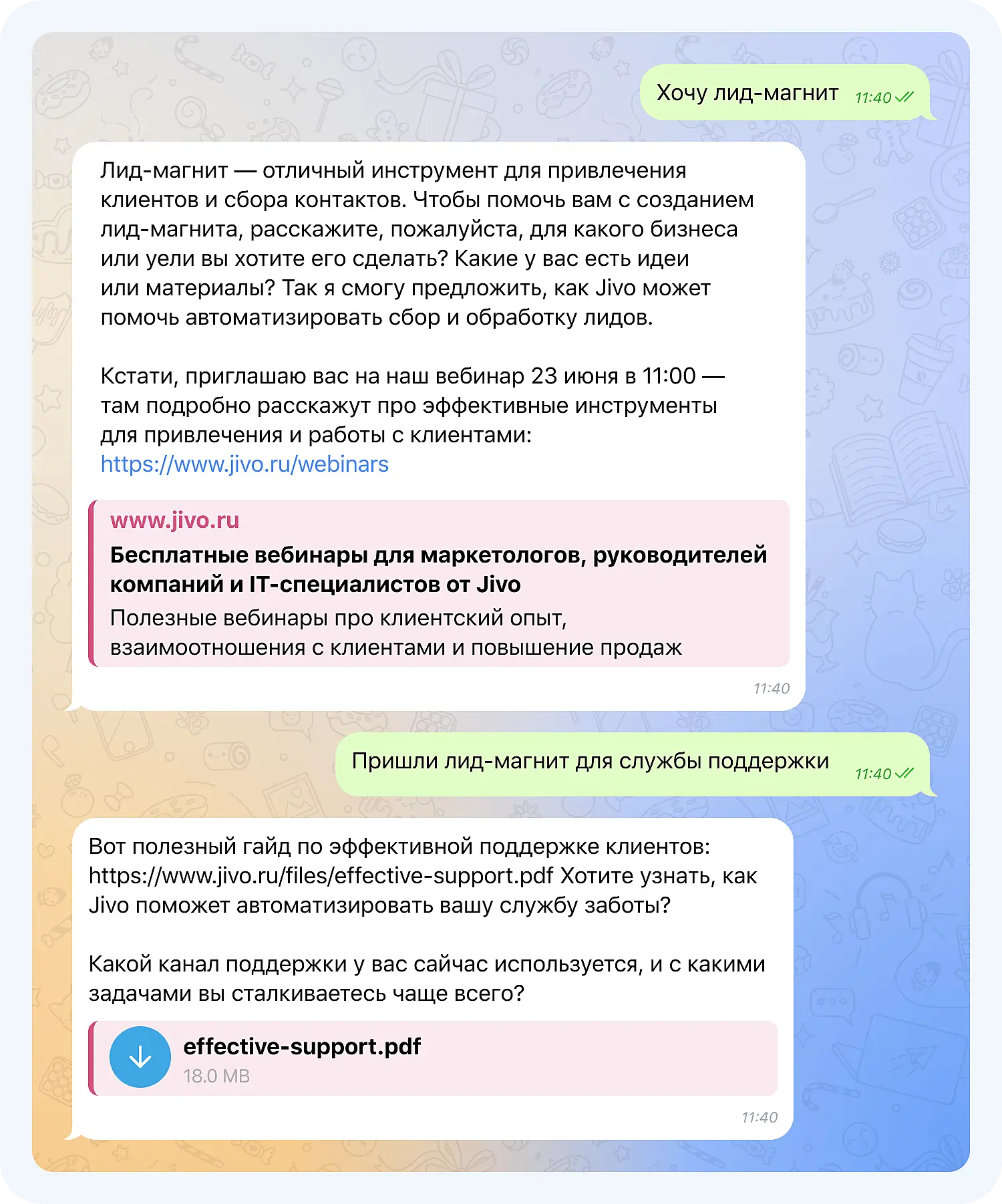 Например, мы создали ИИ-оператора Jivo, добавили в него возможность приглашать на вебинары и отправлять лид-магниты.