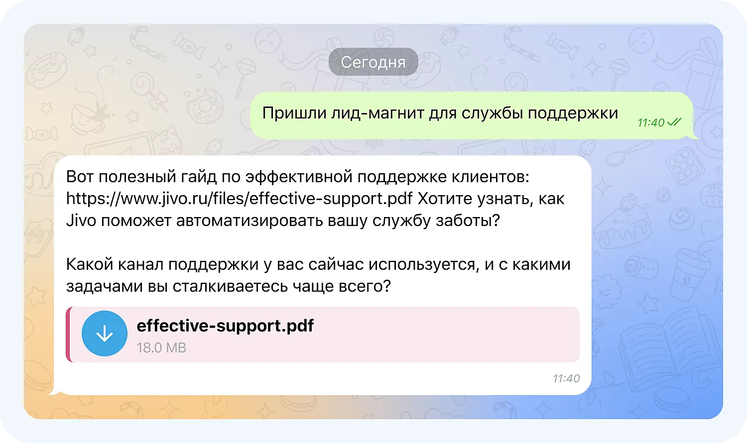 - При упоминании ключевых фраз «гид по поддержке», «улучшить сервис», «документ про поддержку» — отправлять ссылку на лид-магнит по поддержке.