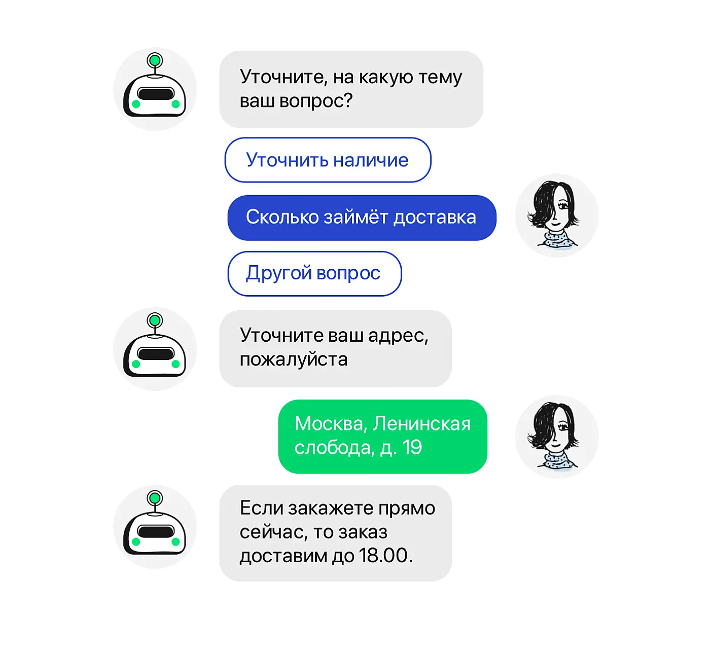 Чат-бот поможет снизить частые шаблонные обращения и сократить нагрузку до 20%. Клиент задаёт типичные вопросы, а чат-бот на них отвечает: например, где находится заказ, какая есть доставка, сколько стоит товар. При этом, чат-бот работает круглосуточно.