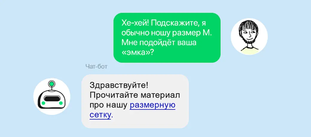 Чат-бот помогает подобрать товар, показывая подходящие варианты. Даже если у вас удобный и понятный сайт, то человек может не захотеть ходить по ссылкам и вникать в ассортимент. Или он привык покупать через мобильное приложение, и ему неудобно пользоваться десктопной версией, какой бы логичной она ни была. А в чате логика всегда одинаковая: бот проконсультирует покупателя и приведёт его к заказу.