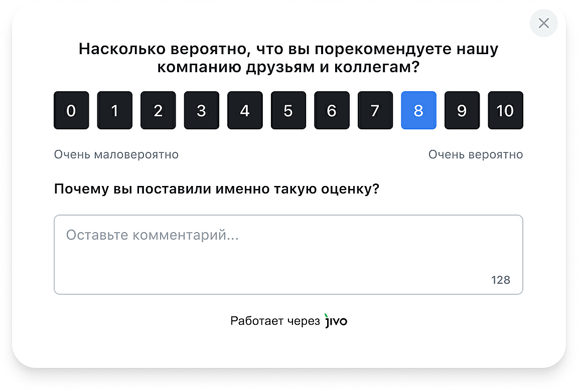 NPS-опросы можно проводить с помощью чат-ботов, e-mail рассылок и других доступных маркетинговых инструментов. Однако удобнее всего использовать готовые формы из блока Jivo Маркетинг: так вы можете задать условие, при котором клиент увидит всплывающее окно (например, посещение конкретной страницы, количество визитов, клик по элементу и т.д.), экспериментировать с текстом опроса и расположением блоков в нем.