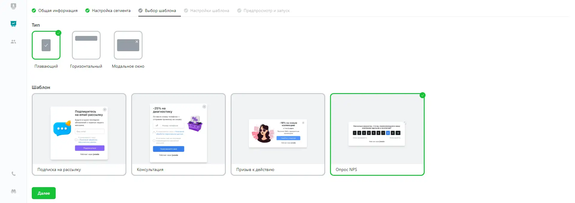 NPS-опросы можно проводить с помощью чат-ботов, e-mail рассылок и других доступных маркетинговых инструментов. Однако удобнее всего использовать готовые формы из блока Jivo Marketing: так вы можете задать условие, при котором клиент увидит всплывающее окно (например, посещение конкретной страницы, количество визитов, клик по элементу и т.д.), экспериментировать с текстом опроса и расположением блоков в нем.