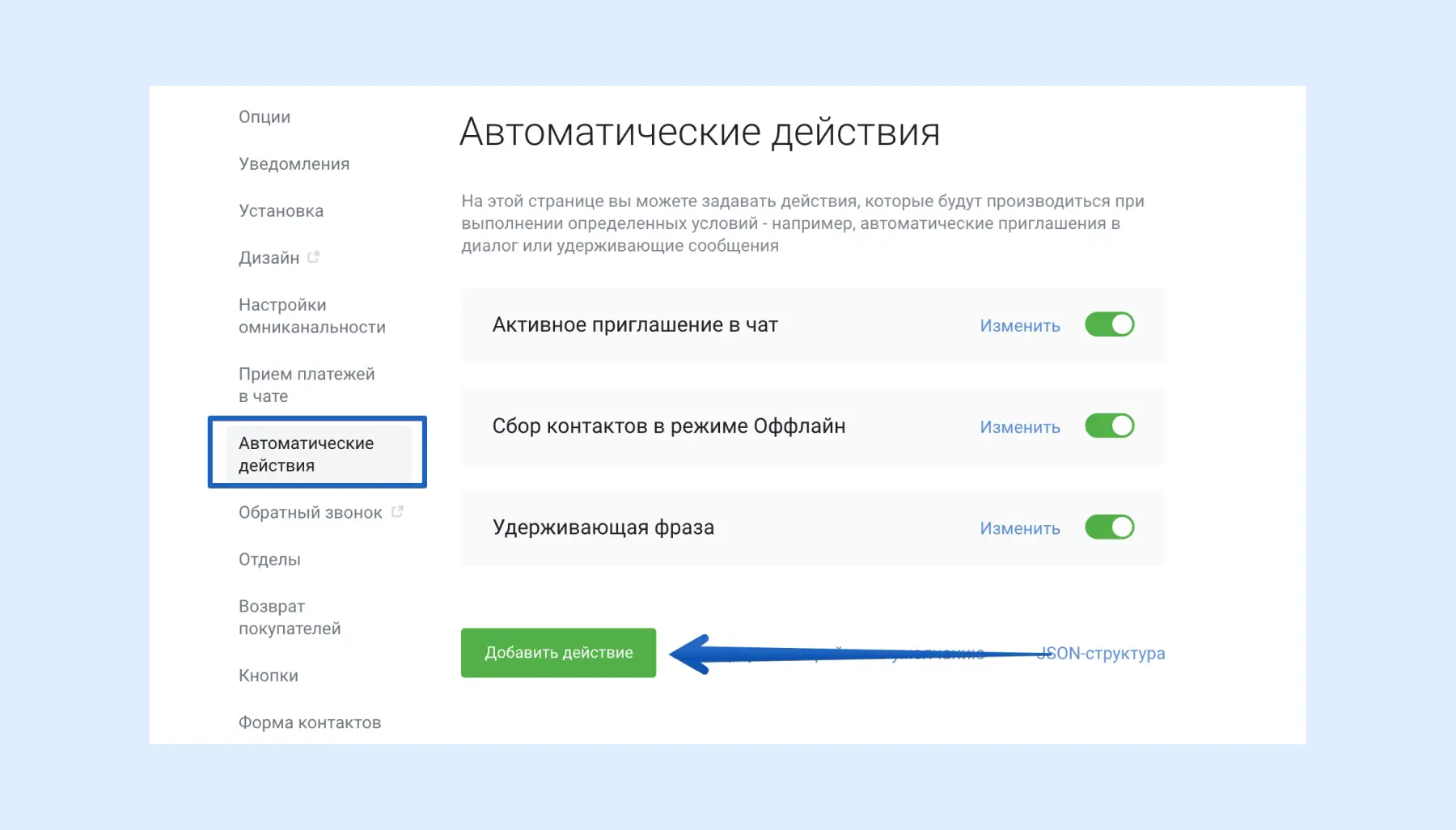 - Показывайте чат по сценарию — по времени, дочитыванию, клику на кнопку. Например, виджет может открываться через несколько секунд после загрузки сайта, чтобы пользователь успел просмотреть контент и не отвлекался.