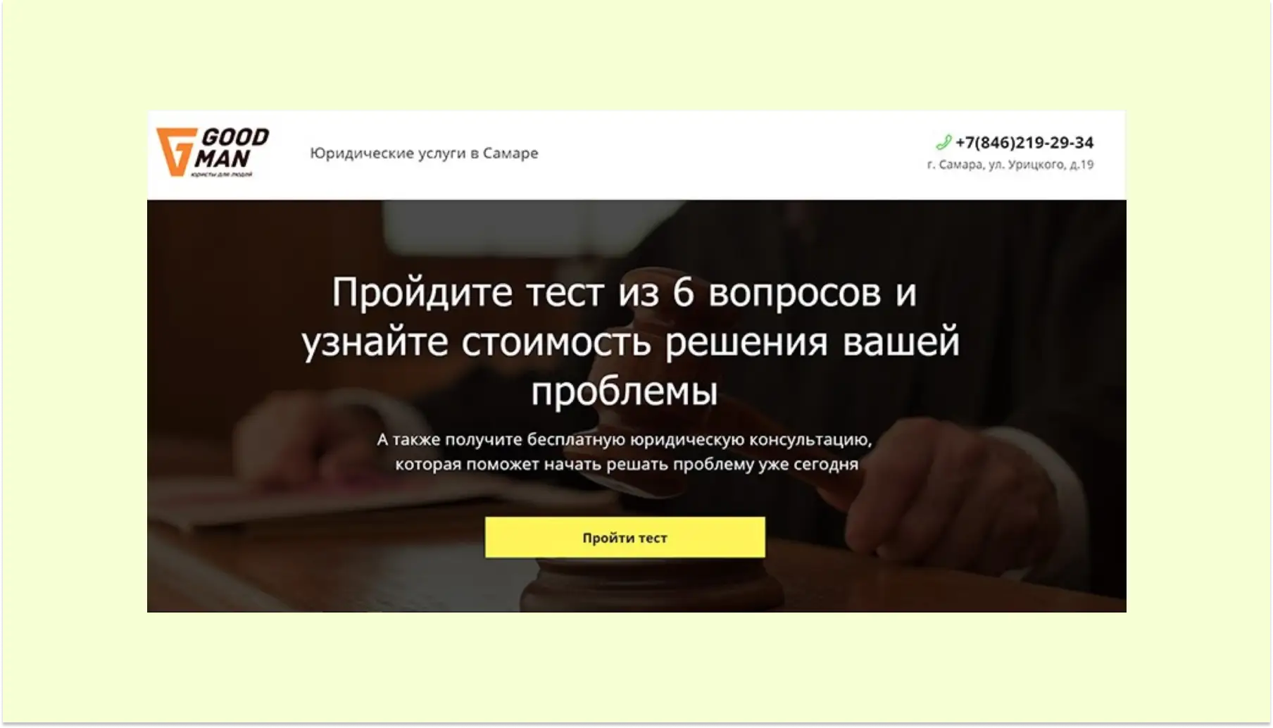 Консалтинговые компании и юридические фирмы предлагают клиентам пройти опрос, чтобы узнать решение своей проблемы или стоимость услуг. Пользователям это удобно, потому что некоторые вопросы могут быть интимными и чувствительными — с менеджером не всем захочется обсуждать такую информацию. А формат квиза как раз убирает неловкость и человеку проще решиться на контакт.