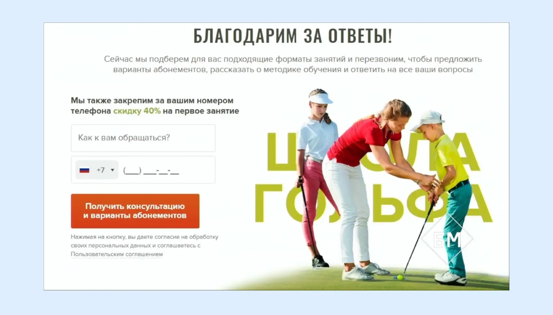 Спортивные клубы и секции танцев предлагают клиентам рассказать о своих пожеланиях в игровой форме, чтобы рекомендовать занятия и подходящий абонемент. А после того как пользователь заполнил форму, ему можно предложить скидку или бонус, чтобы увеличить шансы на покупку.