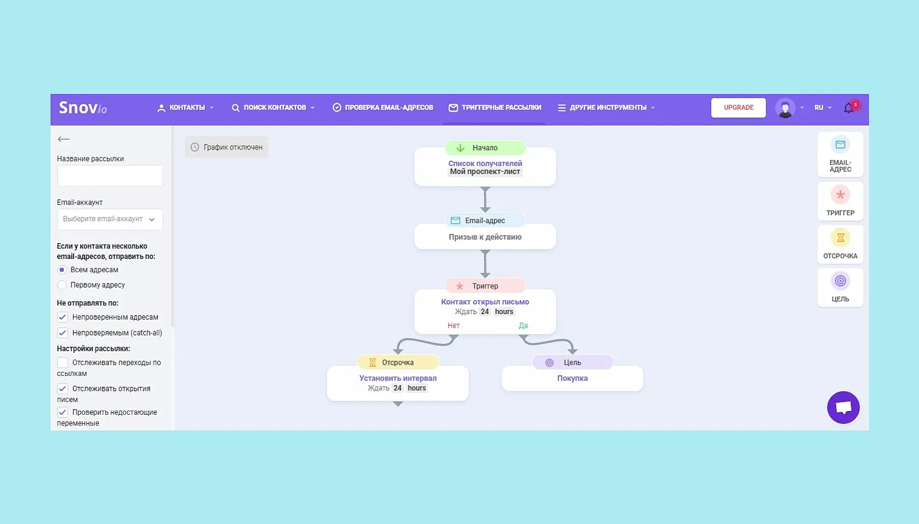 После завершения покупки триггерные рассылки не заканчиваются. Если быть более точными, именно тут можно начать действовать, чтобы превратить случайного пользователя в постоянного клиента. Единственный совет – собирая базу адресов, обязательно периодически проверяйте ее с помощью сервиса Snov.io. Такой поиск по email автоматизирован и занимает мало времени, но это обеспечит письма от попадания в спам и соответственно от попадания в блок.