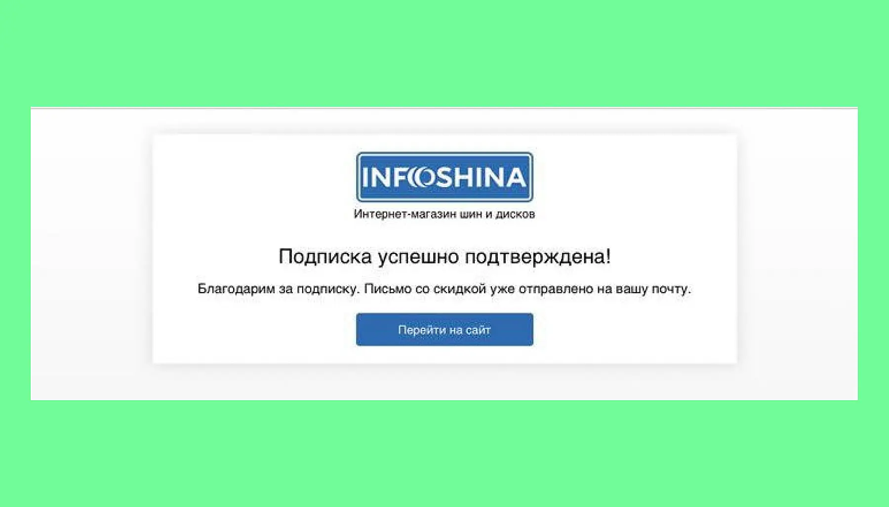 Это наиболее простые письма, которые, в принципе, выполняют свою задачу – прохождение double-opt-in. После клика на ссылку, подписчик переходит на системную страницу. И там его чаще всего ждет обычная фраза – «Подписка успешно завершена». Но, что если эту страницу оптимизировать? Добавить ссылку на сайт с логотипом, придумать интересное предложения, как «здесь вас ждет скидка», добавить промокод и ссылку на социальные сети.