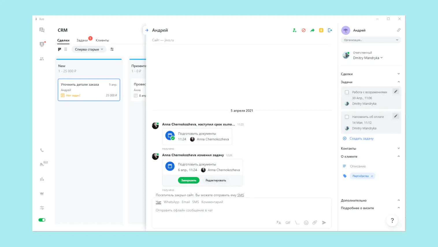 Если вы еще не выбрали подходящий сервис, попробуйте Jivo — это многофункциональное решение для общения с клиентами. С ним вы не пропустите ни одно сообщение благодаря умному чату на сайте, интеграции с почтой, всеми популярными соцсетями и мессенджерами, виртуальной АТС, телефонии и другим возможностям. Инструменты Jivo заточены на обработку сотен входящих сообщений и подойдут каждому бизнесу.
