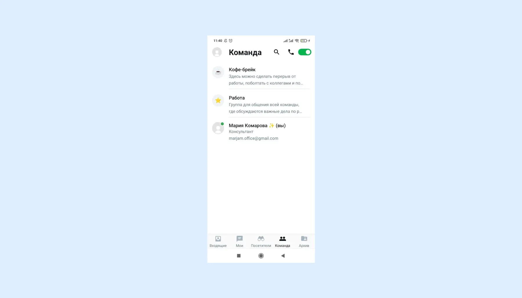В Jivo есть командные чаты, и мобильное приложение также позволяет вам поддерживать связь с командой, где бы вы ни находились. Здесь можно пересылать файлы и изображения и создавать отдельные каналы под разные ситуации, например, завести отдельный чат под конкретный проект.