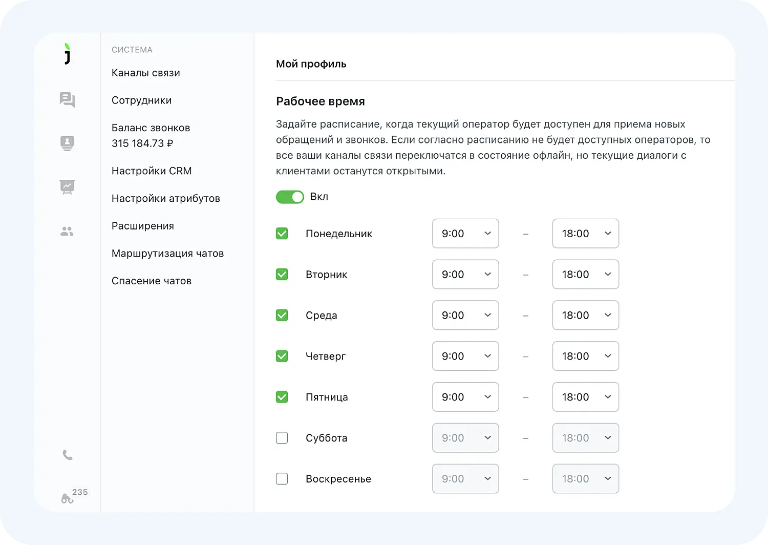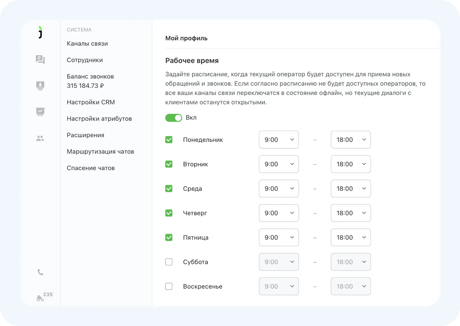 В профиле оператора можно указать часы работы и часовой пояс. В указанный период приложение автоматически изменит статус оператора на «онлайн» и будет направлять ему диалоги. После окончания рабочего дня система самостоятельно переключит оператора в режим «офлайн», а незаконченные чаты перенаправит другим сотрудникам.