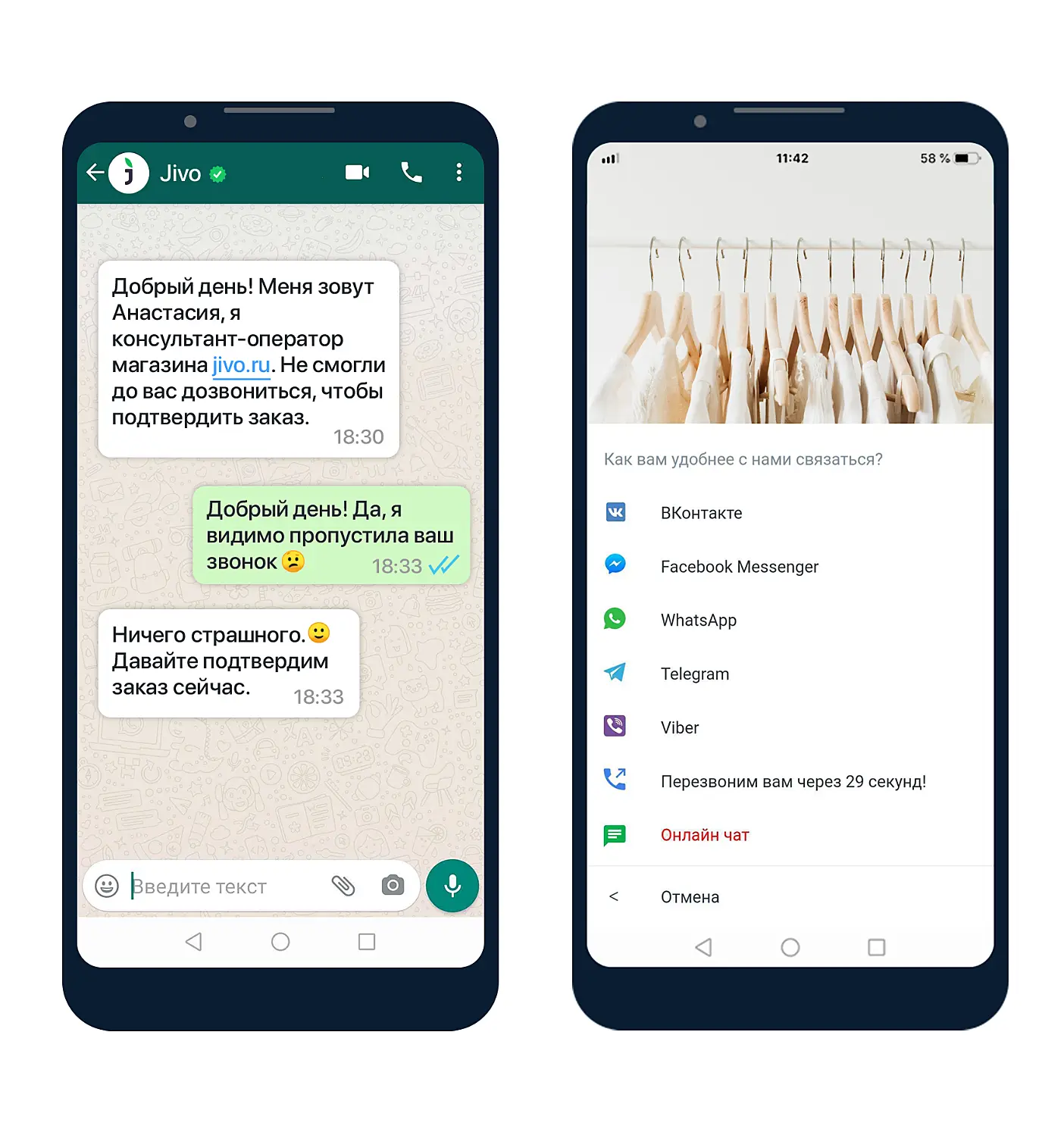 Чтобы общаться с клиентами в WhatsApp, подключите его к Jivo. Как это работает: клиент пишет сообщение в WhatsApp по номеру телефона, который указан на сайте или в социальных сетях и оно сразу появляется в приложении Jivo. Для общения с клиентами оператору достаточно использовать только один сервис. Кроме этого у подключения WhatsApp Business API к Jivo есть ряд преимуществ: