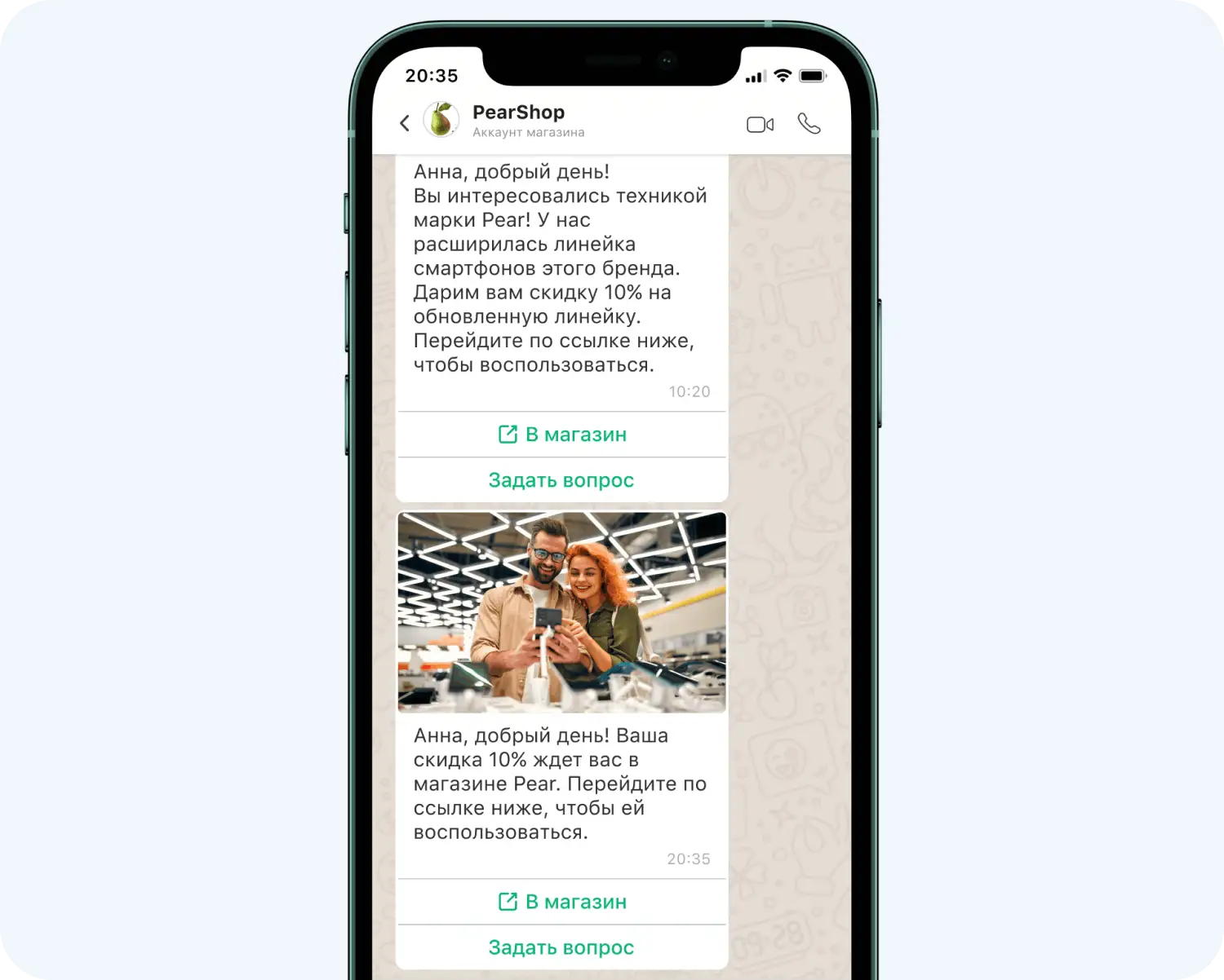 Важный момент — клиент должен согласиться получать рассылку в чате. Это можно сделать двумя способами: пользователь пишет бизнесу первое сообщение или заполняет анкету с чек-боксом, где подтверждает свой номер телефона. В документе должно быть указано, что пользователь согласен получать сообщения от конкретной компании.