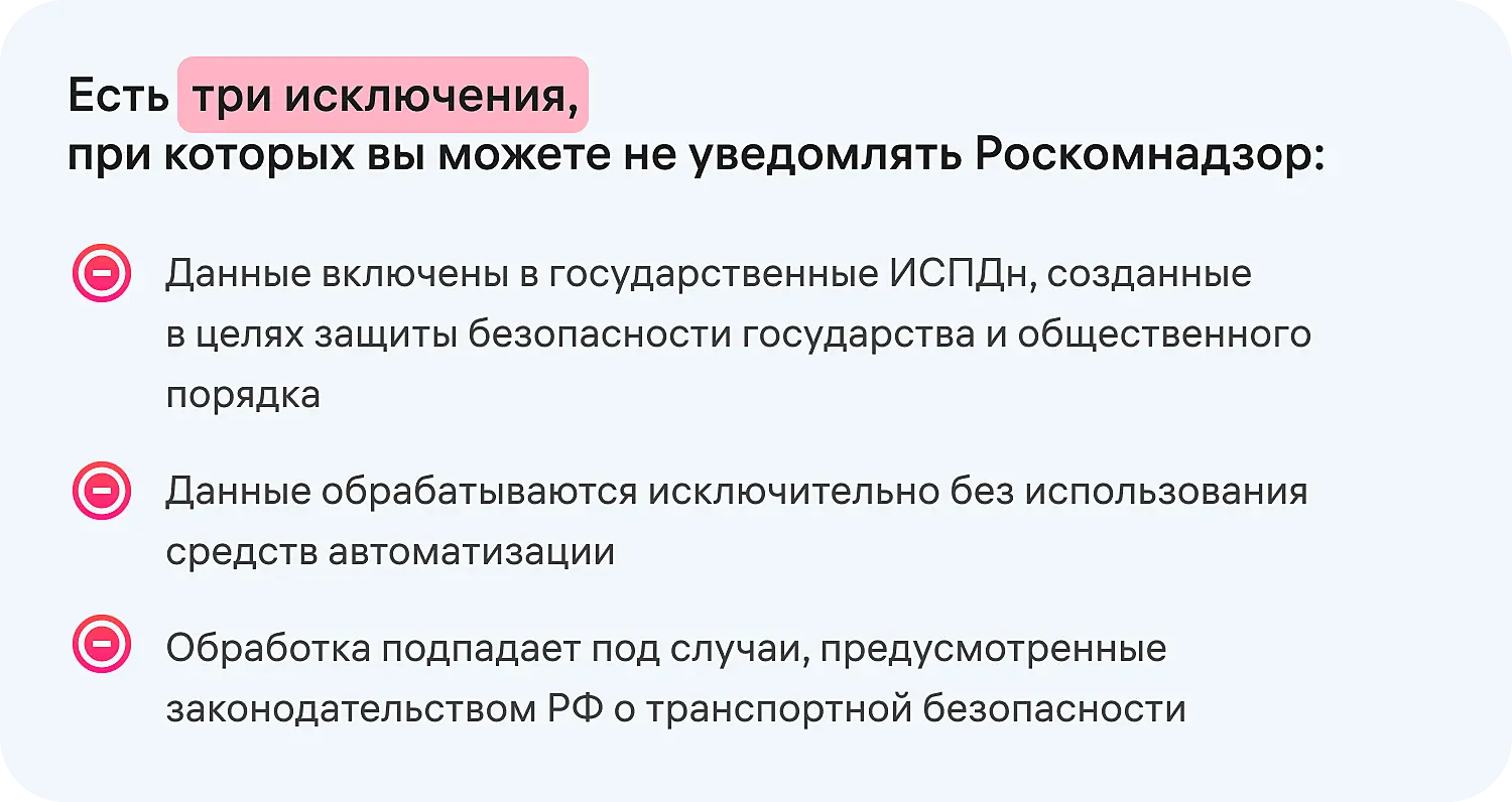 Если ваши бизнес-процессы не попадают в исключения, перечисленные выше, следует проинформировать Роскомнадзор. Вот еще несколько случаев, в которых необходимо предоставить уведомление: