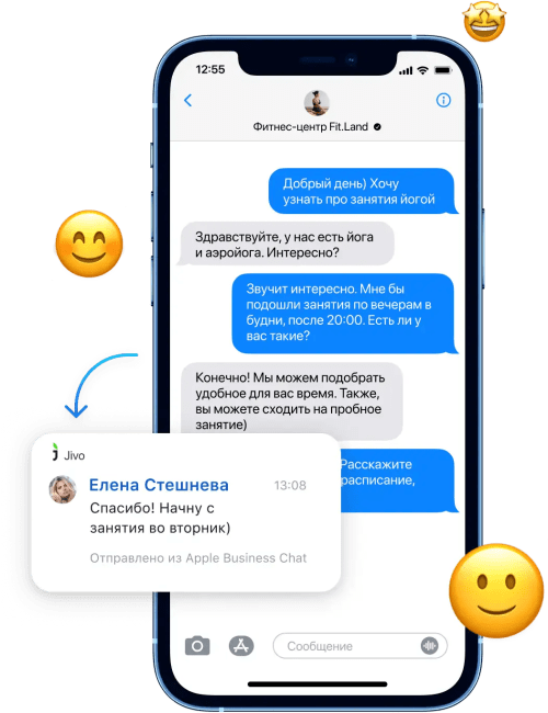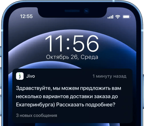 С Jivo пользователям Apple Business Chat не нужно оставаться на странице сайта, чтобы вести диалог. Сообщения от вашей компании доставляются мгновенно в любое время. Клиент получит уведомление, как только оператор ответит