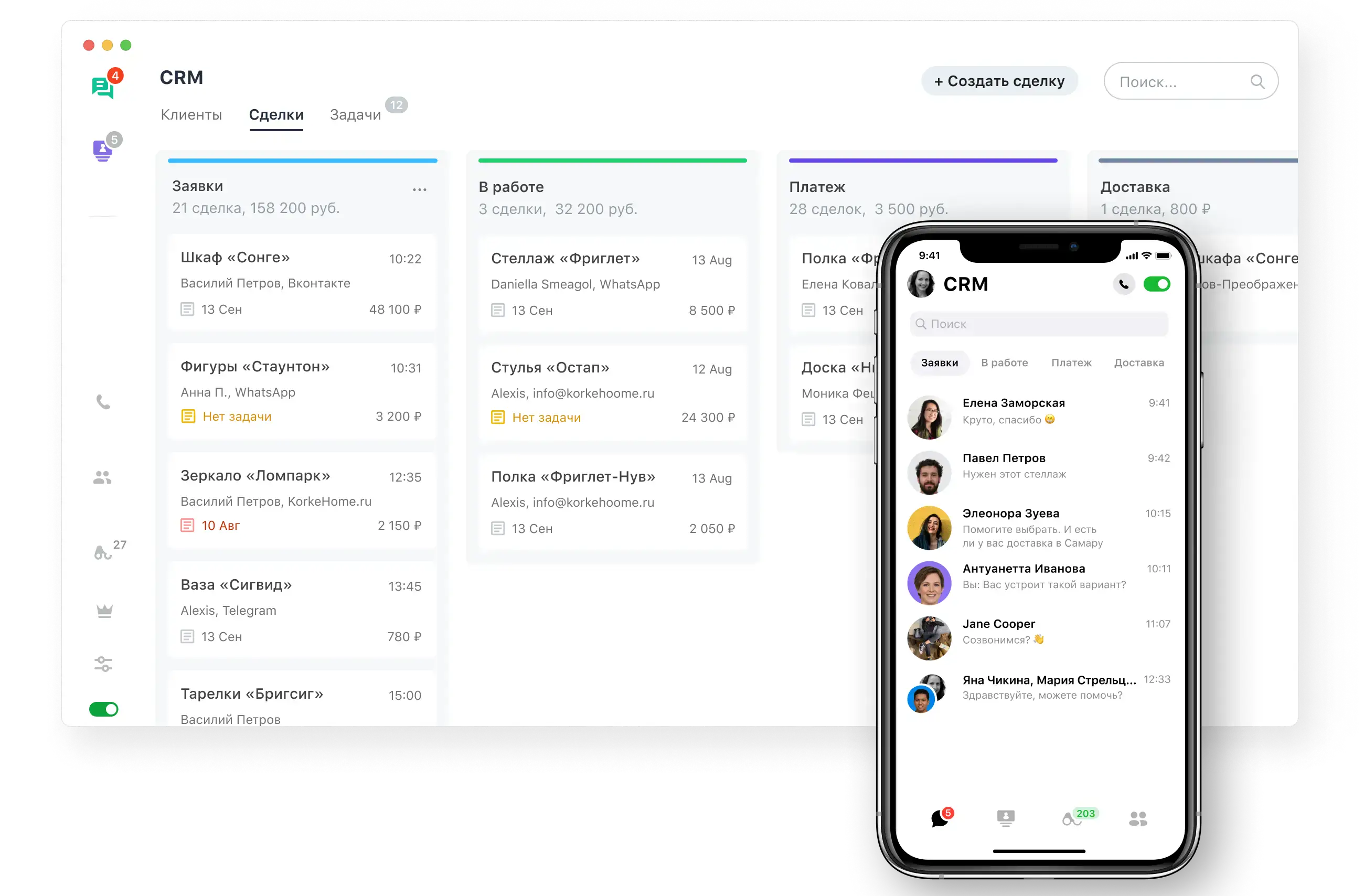 В Jivo CRM можно создать сделку прямо в чате с клиентом. Фиксируйте пожелания и комментарии, отмечайте текущий этап работы с покупателем.
