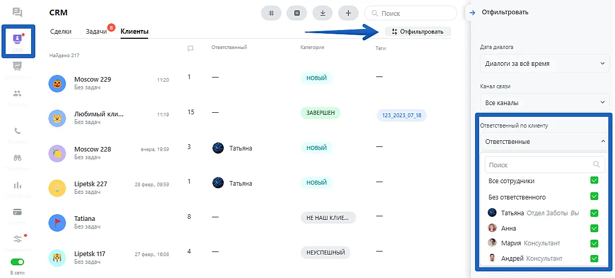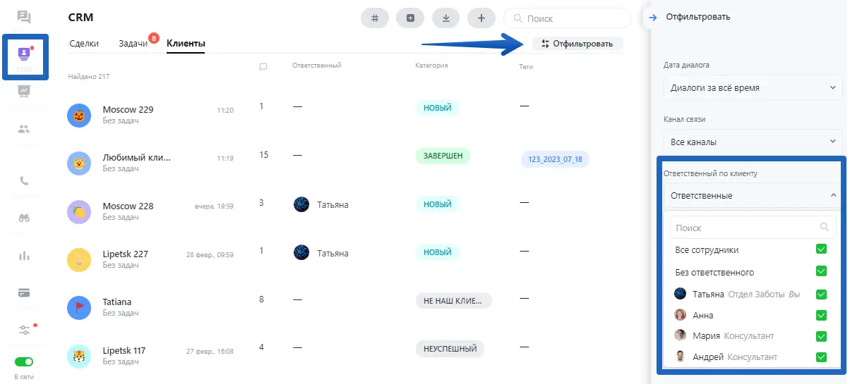 Обратите внимание: эта функция добавлена для удобства фильтрации клиентов в списке и приоритизации обращений. Она не влияет на статистику по обработанным чатам: диалог будет засчитан именно тому оператору, который общался с клиентом.