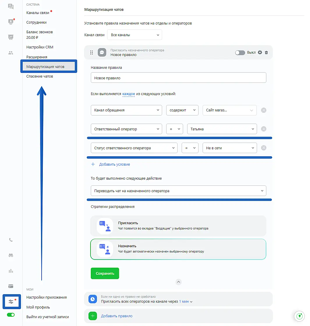 Для этого зайдите в раздел "Управление" > "Маршрутизация чатов".
