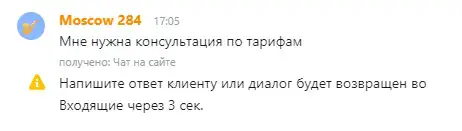 При взятии диалога из раздела "Входящие" или после ответа клиента, запустится таймер спасения чатов. Оператору в диалоге будет показано предупреждение о том, что диалог будет возвращен во "Входящие", если он не ответит, и он увидит таймер.