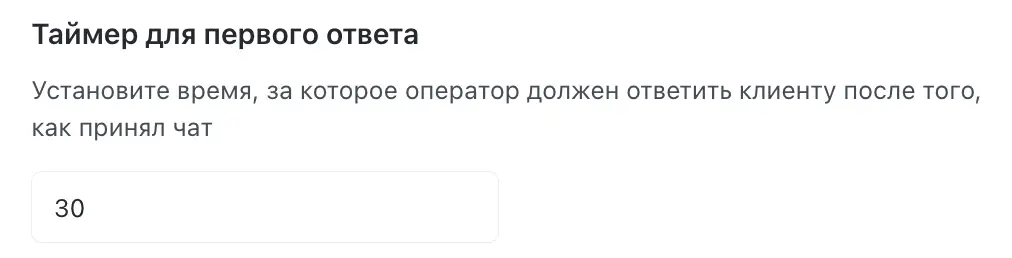 - В поле "Таймер для первого ответа" установите время от 30 до 7 200 секунд, за которое оператор должен ответить клиенту после того, как принял чат. Время по умолчанию – 30 секунд.