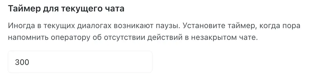 - В поле "Таймер для текущего чата" укажите время, через которое система напомнит оператору о бездействии в открытом диалоге. Значение должно быть также в диапазоне от 30 до 7 200 секунд.
