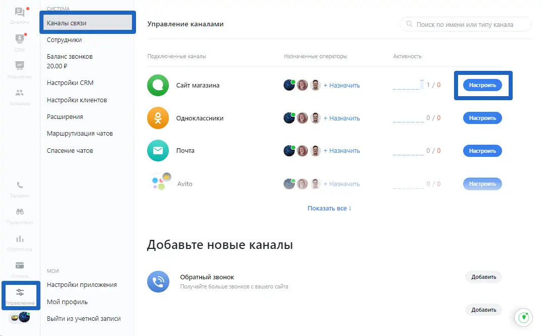 - В приложении Jivo перейдите в раздел "Управление" > "Каналы связи" > "Настроить" справа от нужного канала.