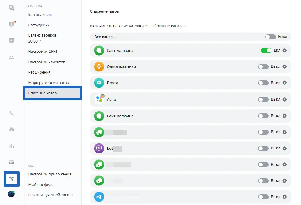 В этом разделе вы можете включить "Спасение чатов" сразу для нескольких каналов связи и быстро перейти в настройки нужного канала.
