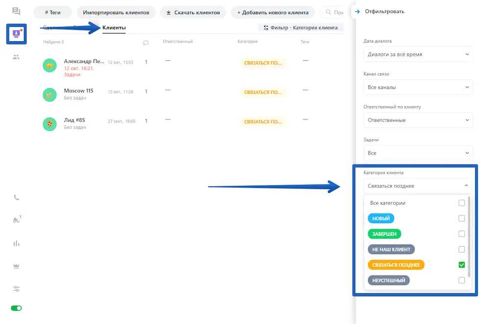 Посмотреть список клиентов с той или иной категорией вы можете в разделе CRM - Клиенты. Нажмите на кнопку «Отфильтровать» и выберите одну или несколько категорий, чтобы увидеть клиентов только с нужным статусом: