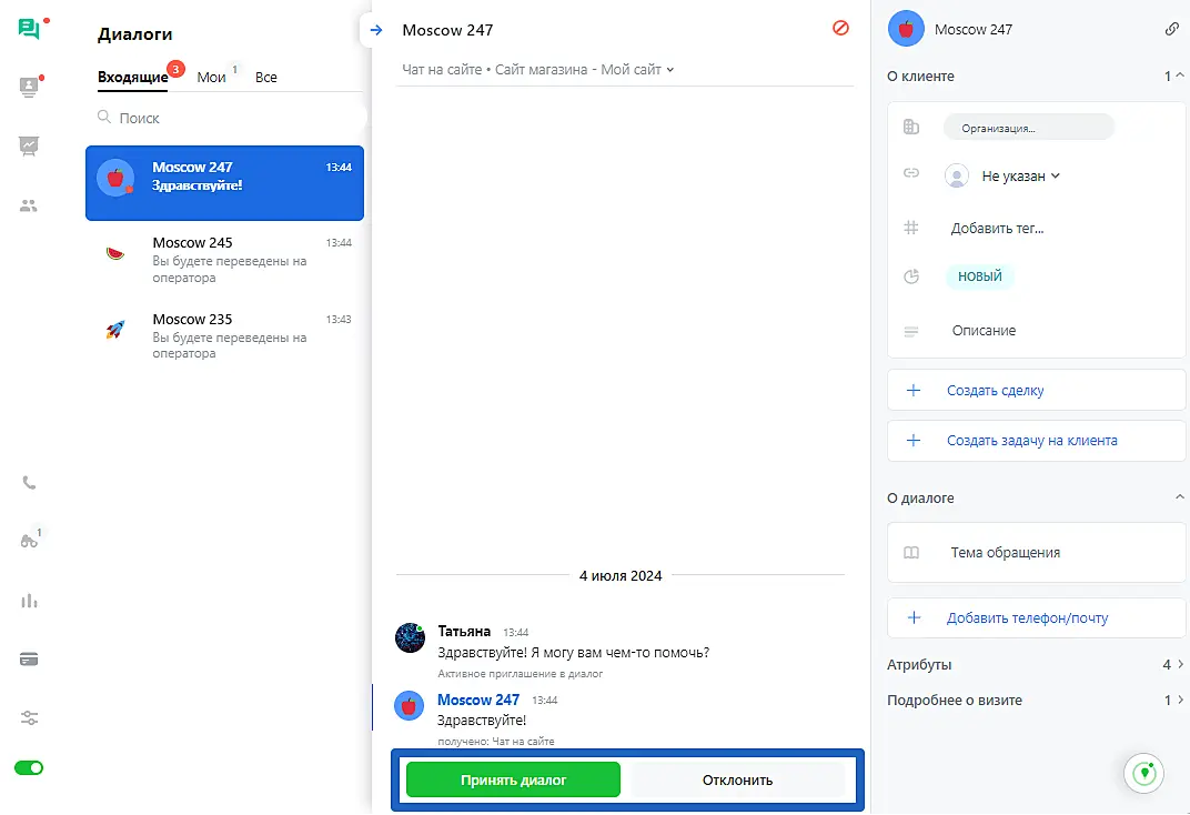 Здесь можно принять диалог или отклонить его. Отклоняя диалог, вы только скроете уведомление о нем. Однако оно напомнит о себе снова через некоторое время и будет появляться до тех пор, пока диалог не будет принят кем-либо из операторов.